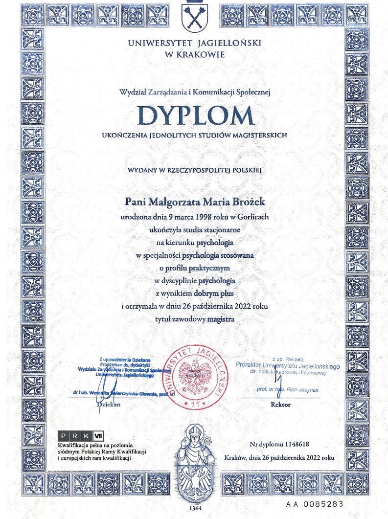 Jestem magistrem Psychologii Stosowanej Uniwersytetu Jagiellońskiego, psychodietetykiem po studiach podyplomowych na Uniwersytecie SWPS, a także psychoterapeutką w trakcie czteroletniego, całościowego kursu psychoterapii w Akademii Motywacji i Edukacji w Warszawie, akredytowanego przez Polskie Towarzystwo Terapii Poznawczej i Behawioralnej. Doświadczenie zdobywałam na dyżurach w Telefonie Zaufania w Ośrodku Interwencji Kryzysowej, w Szkole Mistrzostwa Sportowego Marcina Gortata oraz firmie Wellbeing Polska, w której prowadziłam konsultacje psychologiczne dla pracowników międzynarodowych korporacji. Aktualnie pracuję z osobami dorosłymi w prywatnych gabinetach w Krakowie, przy ulicy Królewskiej i na Osiedlu Centrum E. W pracy skupiam się na empatycznym rozumieniu trudności Klienta oraz wsparciu w ich rozwiązywaniu. Wiem, jak trudne może być mówienie o wrażliwych tematach, dlatego zawsze dbam o to, by stworzyć bezpieczną atmosferę bez oceniania. Oferuję konsultacje psychodietetyczne na których wspólnie zmieniamy relację z jedzeniem oraz terapię psychologiczną dla osób doświadczających nadmierny stres lub lęk, przechodzących kryzys, trudności w relacjach lub brak motywacji. Koncentruję się na mocnych stronach danej osoby, wyszukując rozwiązań dla napotykanych trudności. Nie patrzę na człowieka jak na problem do naprawienia, a jak na piękno i potencjał do odkrycia.