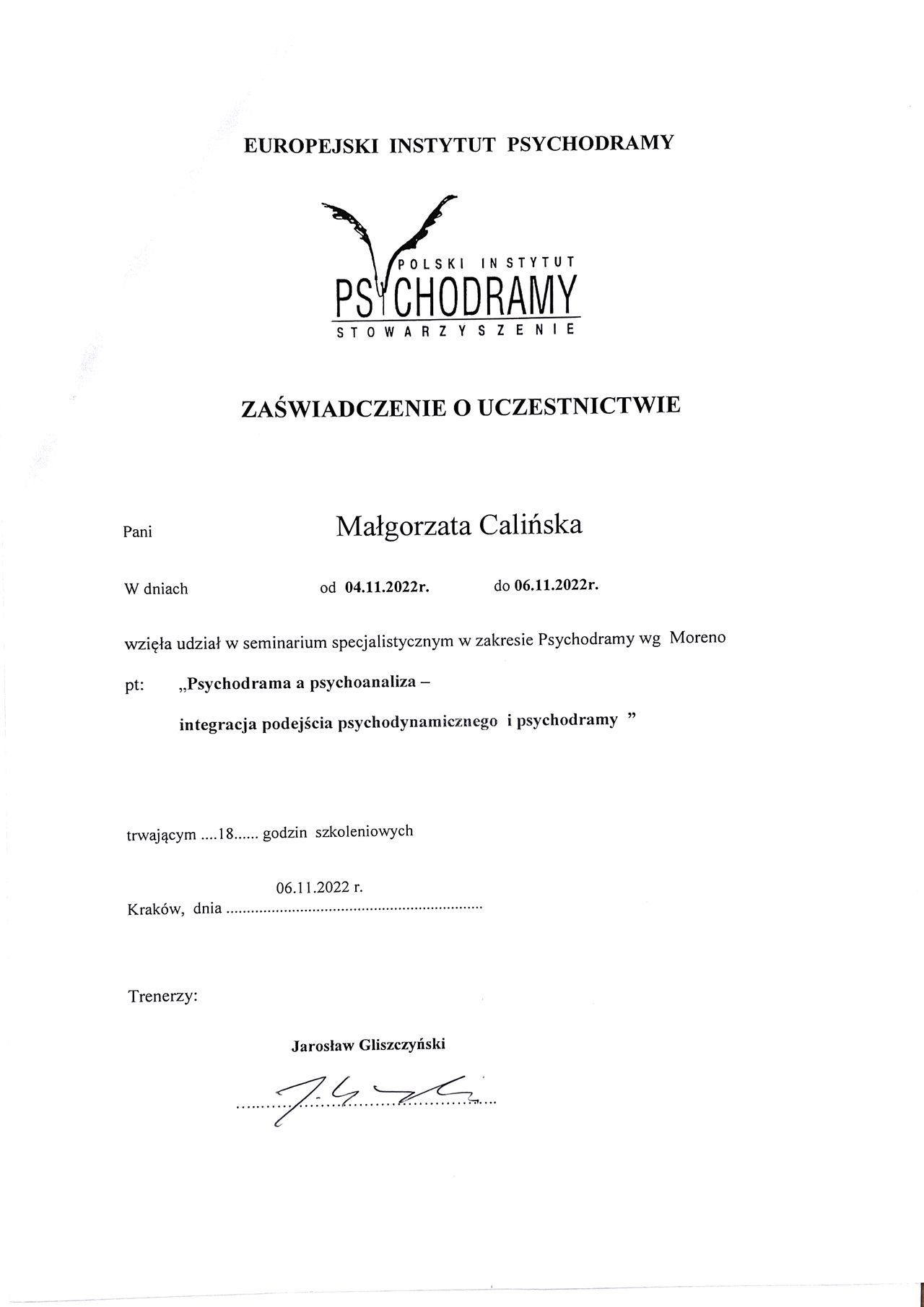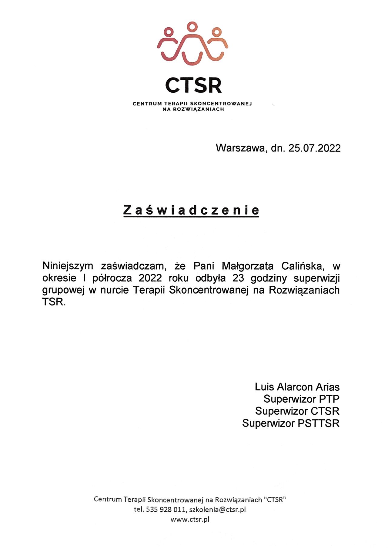 Psychologia jest dla mnie bardzo osobistą, życiową drogą i wielką pasją. Korzystam z doradztwa wielu nauczycieli, a moje sesje podlegają stałej superwizji indywidualnej i grupowej, m. in. u certyfikowanych superwizorów Polskiego Towarzystwa Psychiatrycznego. Wysokie standardy etyczne od początku mojej pracy zawodowej były dla mnie niezwykle ważne dlatego też bardzo duży nacisk kładę zarówno na szkolenia dokształcające, jak i na własny głęboki, wieloletni rozwój osobisty.