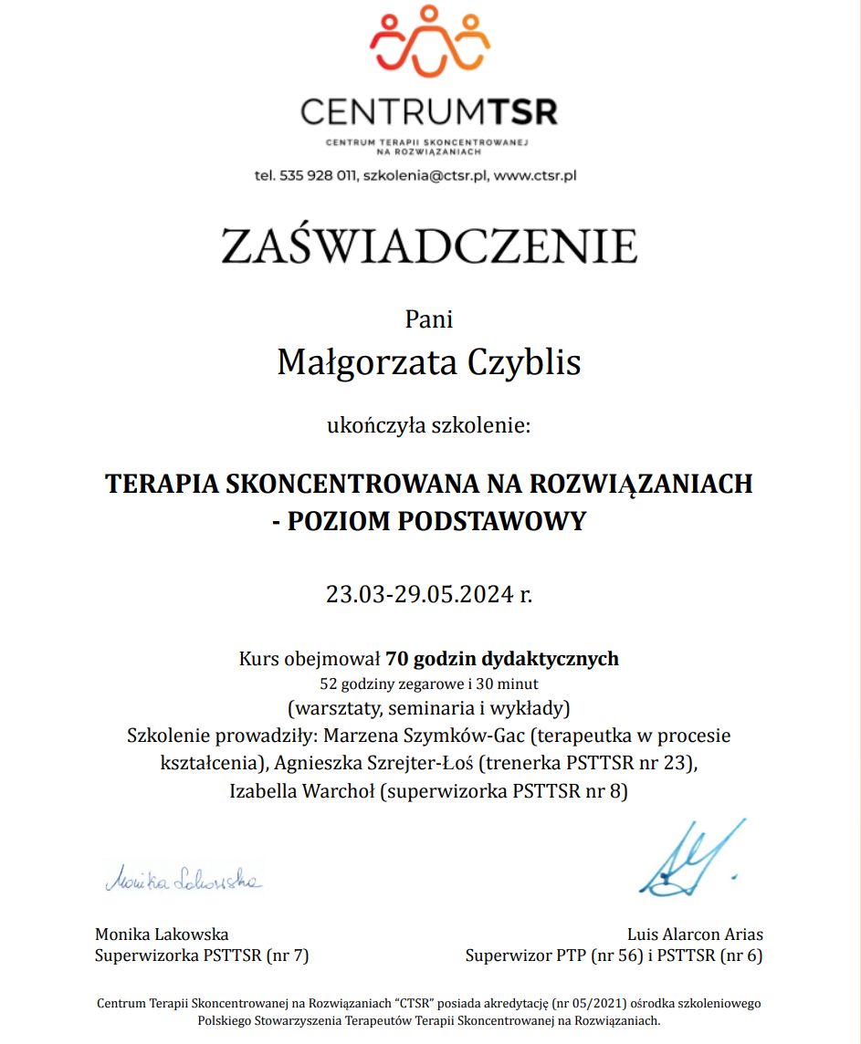 Miałam przyjemność korzystać z pomocy psycholożki Małgorzaty Czyblis i z pełnym przekonaniem mogę powiedzieć, że to jedna z najbardziej rzetelnych, empatycznych i profesjonalnych specjalistek, z jakimi miałam do czynienia. Od pierwszego spotkania ujęła mnie swoją spokojną i ciepłą postawą, która sprawia, że człowiek czuje się bezpiecznie i swobodnie, nawet gdy mówi o bardzo trudnych sprawach.