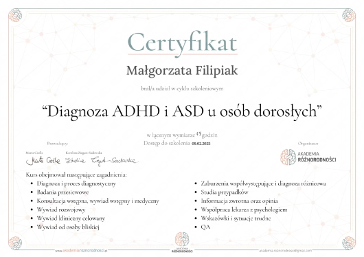 Czy Małgorzata Filipiak przyjmuje online, bez konieczności pojawiania się w placówce?Tak, Małgorzata Filipiak oferuje konsultacje online. Wybierz opcję „konsultacja online” przy umawianiu wizyty, a zobaczysz dostępne terminy.