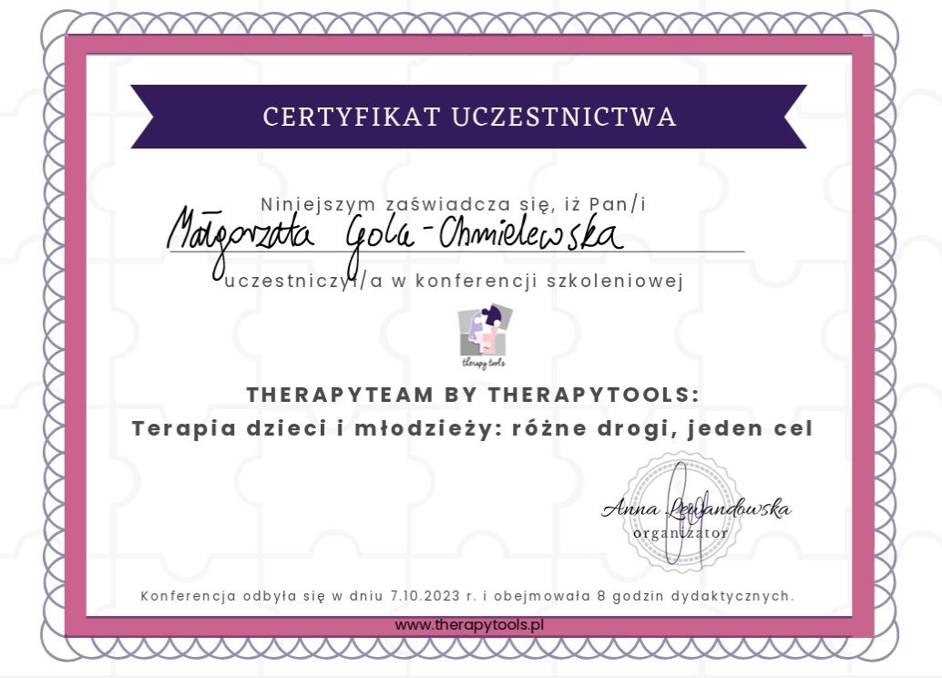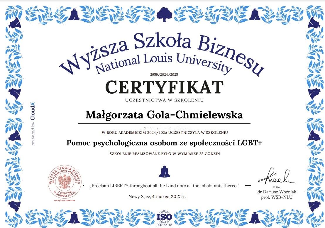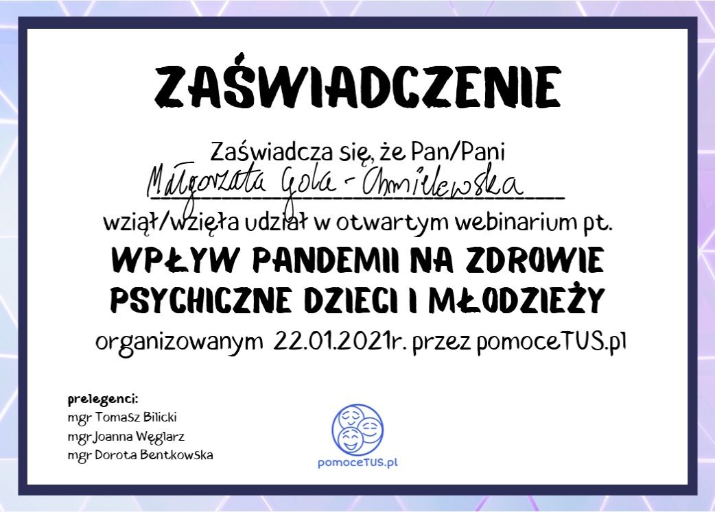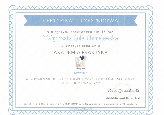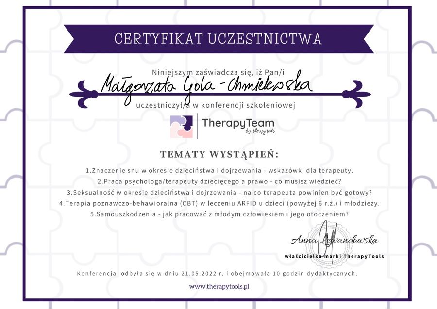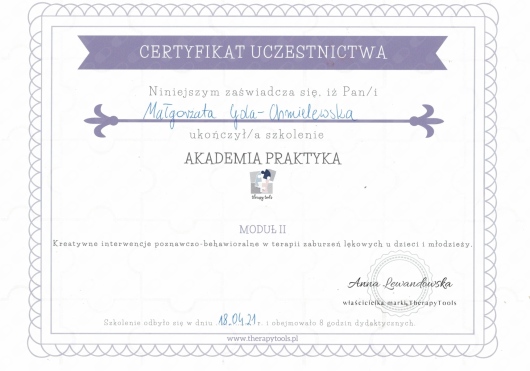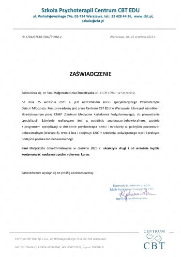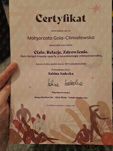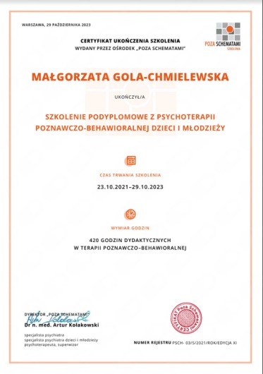 Jestem absolwentką Uniwersytetu Szczecińskiego na kierunku psychologia. Psychoterapeutką w trakcie szkolenia w Towarzystwie Psychologii Procesu, ponadto uczestniczką akredytowanej przez CMKP specjalizacji z psychoterapii dzieci i młodzieży w Centrum CBT EDU. Ukończyłam szkolenie podyplomowe z psychoterapii poznawczo-behawioralnej dzieci i młodzieży w Poza Schematami.