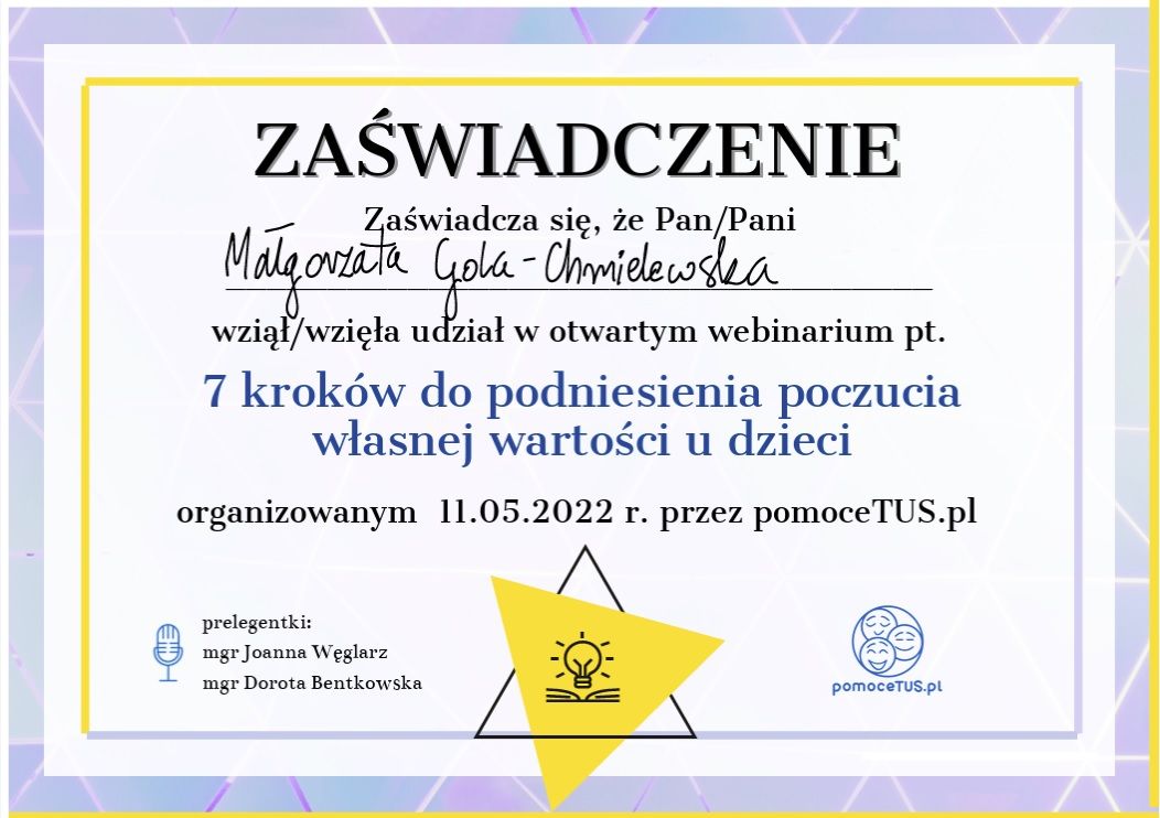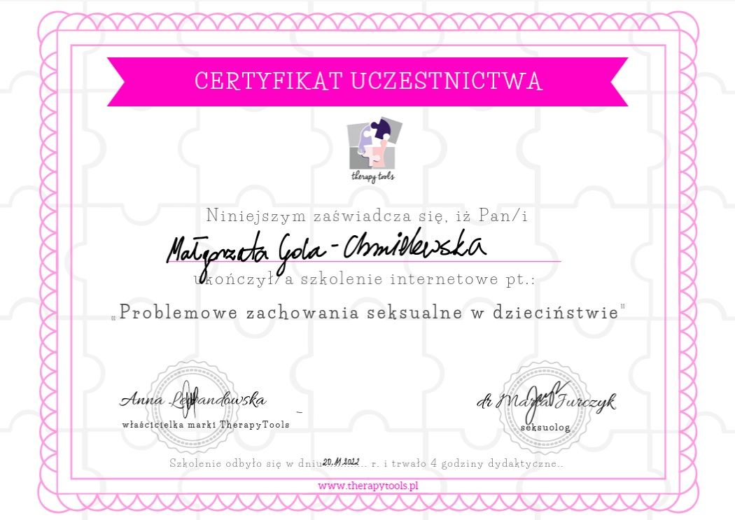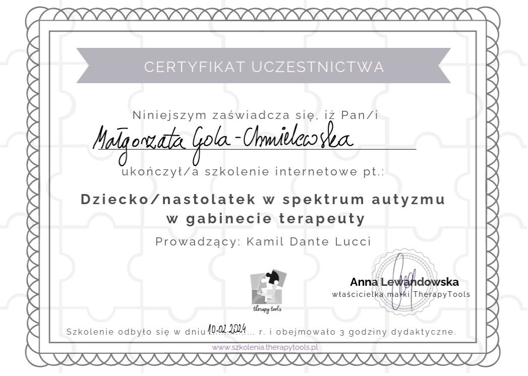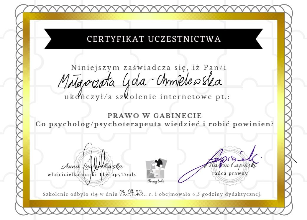 Bardzo ważne jest dla mnie poszerzanie wiedzy, w związku z tym mam za sobą wiele szkoleń, min.: