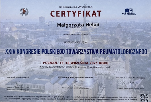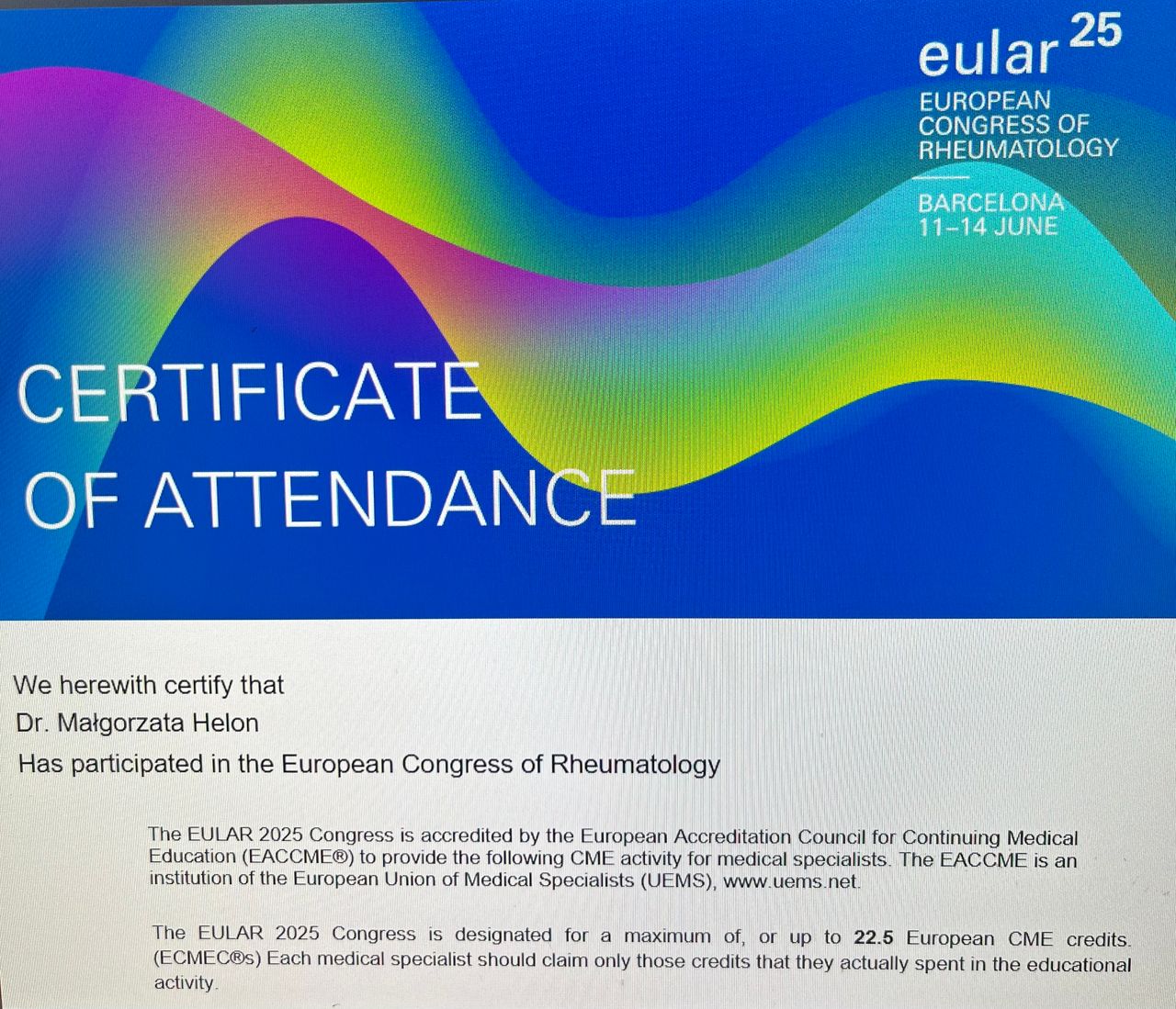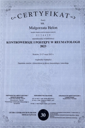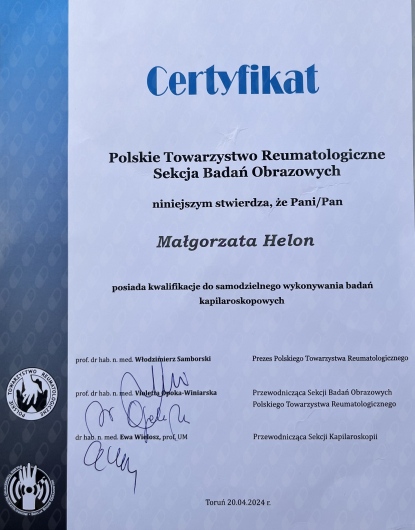 Posiada certyfikat Polskiego Towarzystwa Reumatologicznego Sekcji Badań Obrazowych do samodzielnego wykonywania kapilaroskopii.