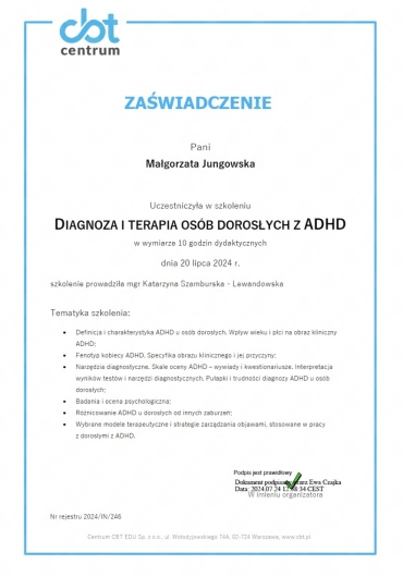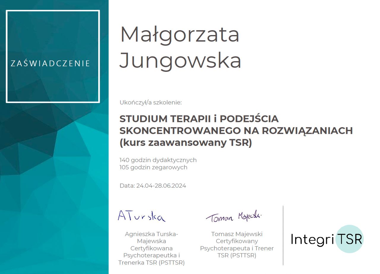 Z całego serca polecam Panią Małgorzatę Jungowską. Trafiłam do niej w jednym z najtrudniejszych momentów mojego życia, zmagając się z silnym stresem pourazowym i lękami. Dzięki jej empatii, profesjonalizmowi i cierpliwości, krok po kroku odzyskałam poczucie bezpieczeństwa i wewnętrznej siły. Spotkania odbywały się w atmosferze pełnej zrozumienia, bez oceniania, z ogromnym wsparciem. To specjalistka z prawdziwym powołaniem, która potrafi towarzyszyć w procesie zdrowienia z wielkim taktem i szacunkiem. Jestem ogromnie wdzięczna za wszystko, co dla mnie zrobiła.Dziękuję
