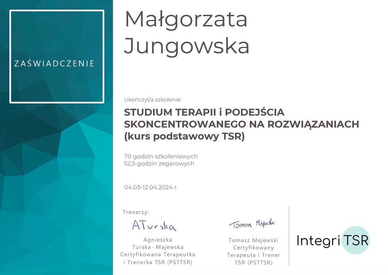 Pani Małgorzata pomogła mi odzyskać radość z życia i kontrolę nad nim. Długo szukałam odpowiedniego dla siebie terapeuty, który będzie w stanie mi pomóc, i wreszcie znalazłam. Nie mogłam trafić lepiej. Gorąco polecam współpracę z Panią Małgorzatą Jungowską.
