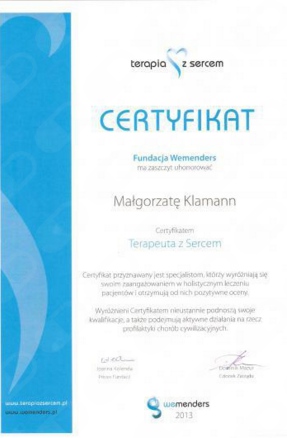 W 2013 roku uhonorowano mnie przez Fundację Wemenders Certyfikatem Terapeuty z Sercem.