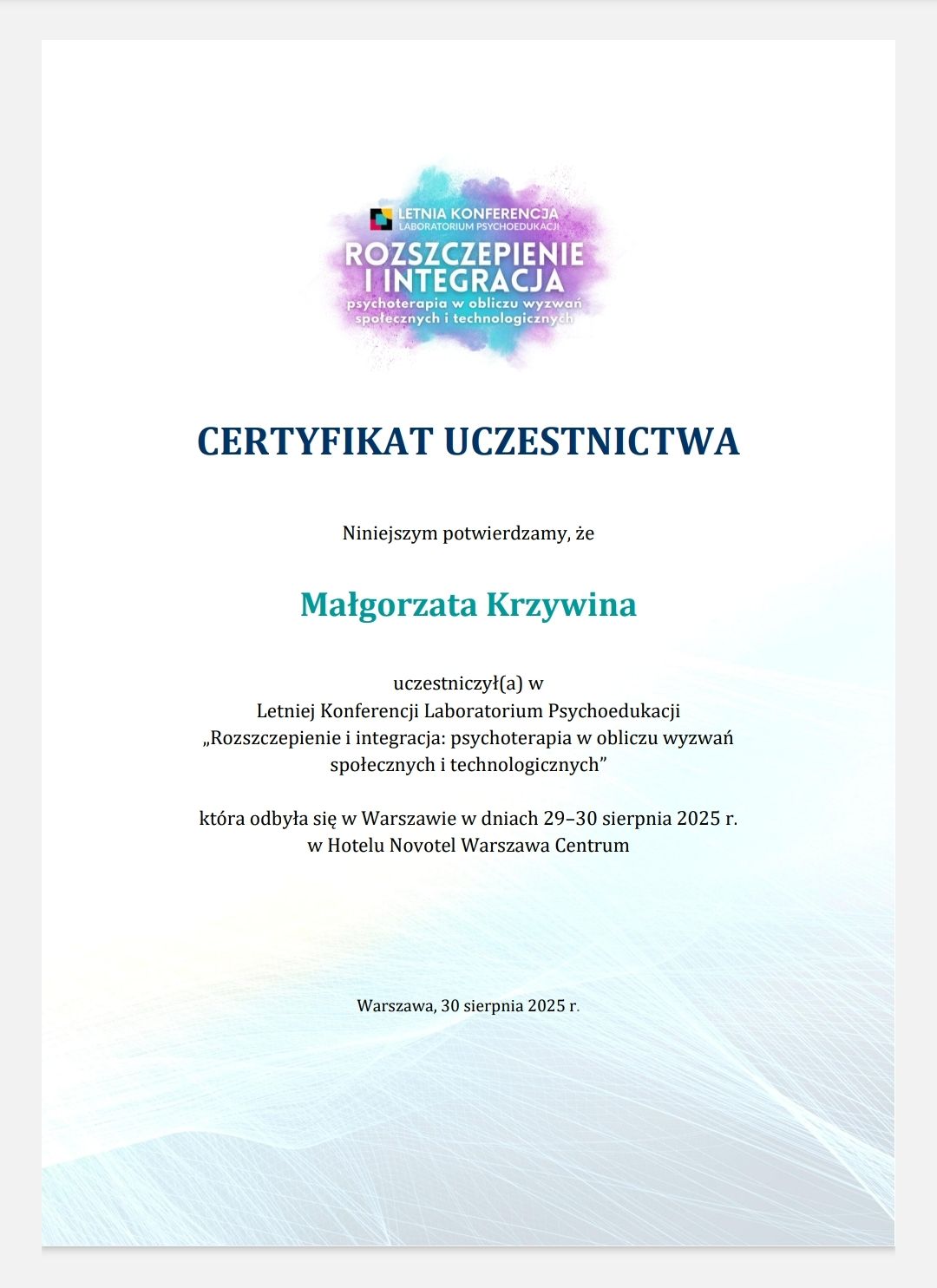 Jestem bardzo zadowolona z terapii z Panią Małgorzatą. Moje podejście do pewnych spraw zmieniło się. Wiem, że jeszcze dużo pracy przede mną, ale z poradami Pani Małgorzaty będzie to łatwiejsze do zrealizowania. Pani Małgorzata to ciepła osoba. Jako dobry słuchaczy potrafi wrócić do problemu i zająć się nim. Jest to osoba godna polecenia