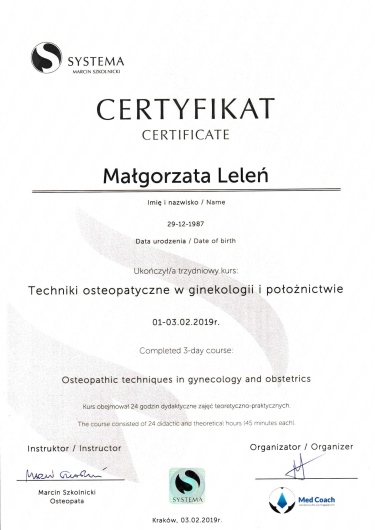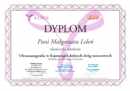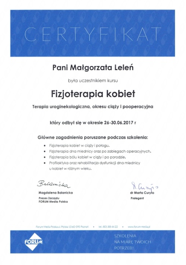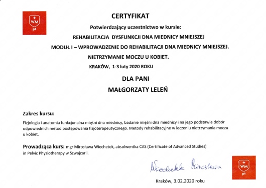 Pani Małgosia jest wspaniałą fizjoterapeutką uroginekologiczną. Profesjonalistką w swoim fachu. Przemiła, życzliwa i bardzo komunikatywna. Posiada wspaniałe podejście do pacjentów i w pełni angażuje się w pracę. Na początku pierwszej wizyty przeprowadza dokładny wywiad. Wykazuje wielką empatię, uważnie wysłuchuje pacjenta .W czasie zabiegu tworzy komfortową i przyjazną atmosferę. Po zabiegu daje praktyczne wskazówki i ćwiczenia. Przy tym jest bardzo kompetentna, posiada ogromną wiedzę, wyczerpująco omawia problem. Wykonane zabiegi przynoszą oczekiwane efekty. Po terapii od razu czułam poprawę. Bardzo ważna jest też elastyczność w dostosowaniu do potrzeb pacjenta. Z całego serca polecam Panią Małgosię.