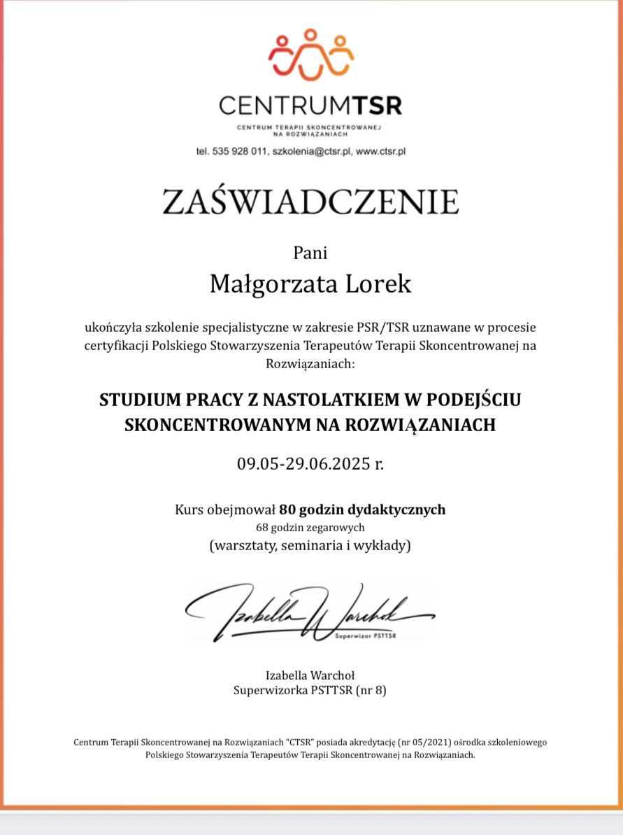 Regularnie uczestniczę w szkoleniach i konferencjach poszerzających moją perspektywę zawodową. Dbam o wysoką jakość swojej pracy, korzystając z regularnej superwizji indywidualnej i grupowej.