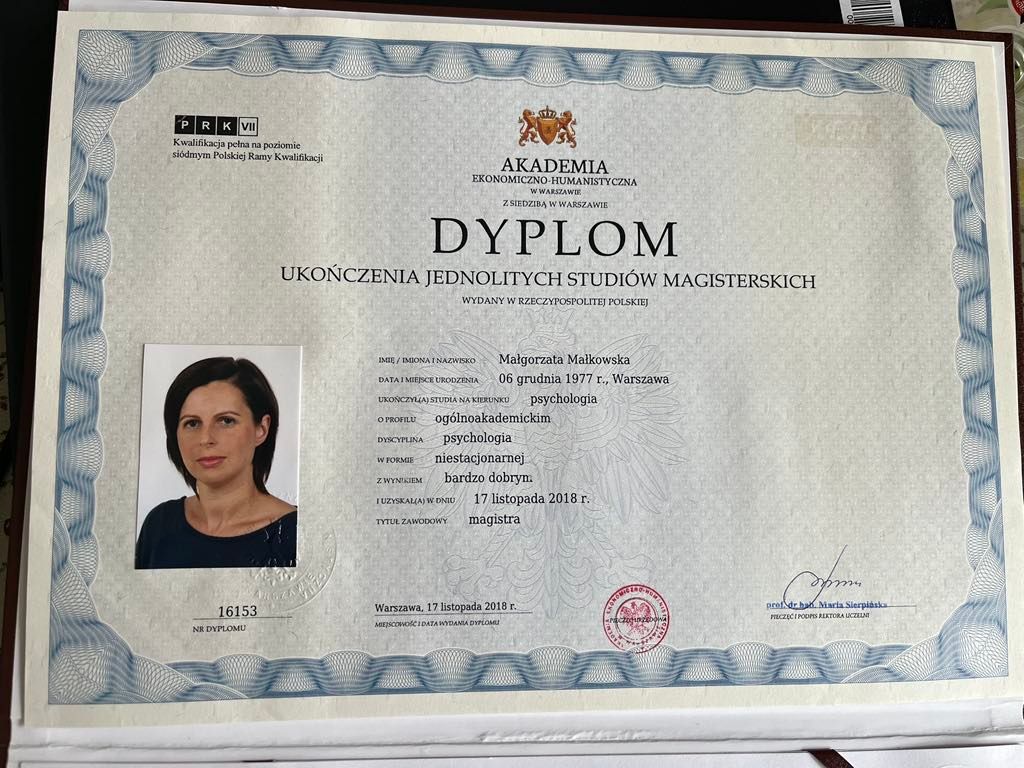 Ukończyłam Psychologię Kliniczną w Akademii Ekonomiczno -Humanistycznej w Warszawie a następnie kontynuowałam naukę na kursie podyplomowym Uważność i Współczucie (Podstawy, Badania, Psychoterapia) w SWPS. Ukończyłam również kurs I i II stopnia Terapii Skoncentrowanej na Rozwiązaniach oraz jestem absolwentką Szkoły Coachów Meritum z akredytacją ICF.