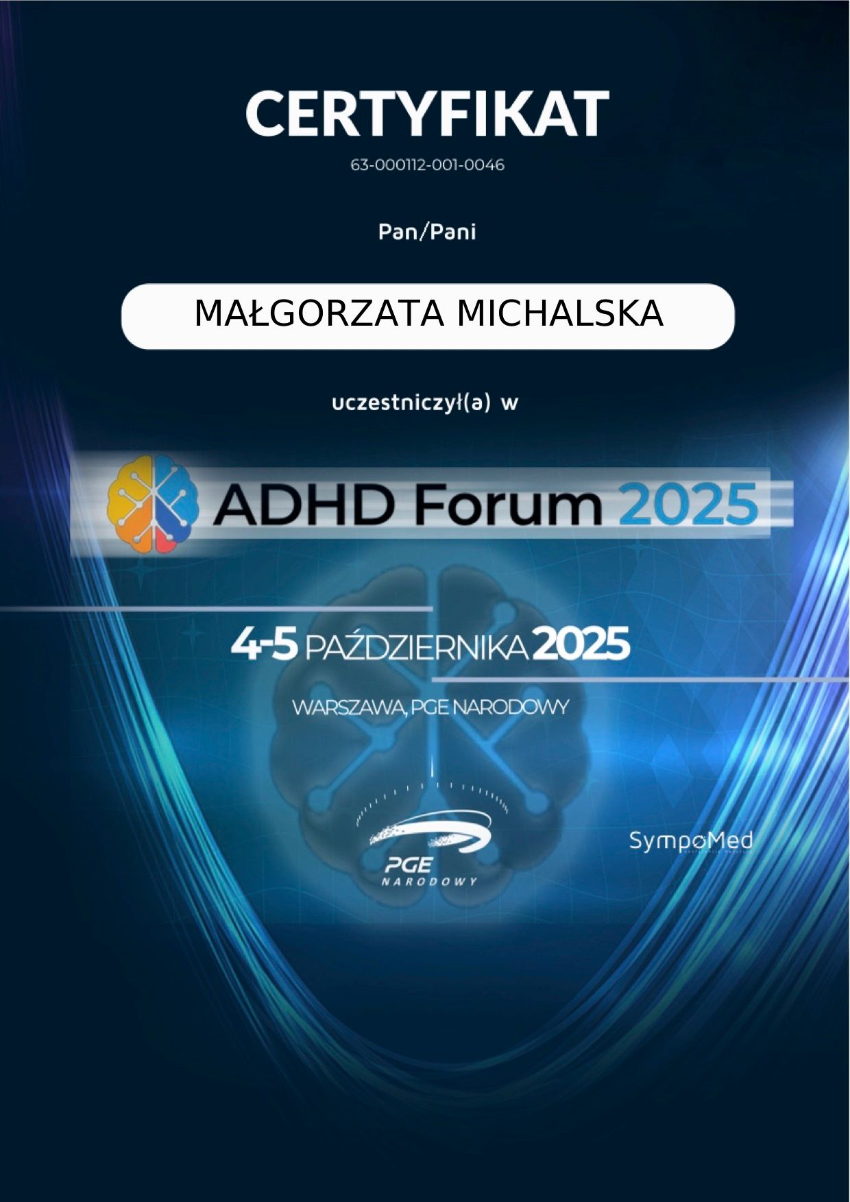 Moja wizyta miała na celu diagnozę w kierunku ADHD. Miałyśmy w sumie dwa spotkania online, które odbyły się w przyjaznej atmosferze i bez pośpiechu. Na początku został przeprowadzony dokładny wywiad, podczas którego odpowiadałam na pytania dotyczące mojej historii życia, dzieciństwa, pracy, rodziny i relacji. Następnie przeszłyśmy do testu diagnostycznego. Pani Małgorzata notowała moje słowa, dopytywała o szczegóły i wykazywała się empatią, kiedy opowiadałam o moich trudnościach. Czułam się zrozumiana i wysłuchana bez oceniania, co bardzo doceniam. Raport z testu i diagnozę dostałam po mniej więcej tygodniu. Bardzo dziękuję za optymizm, zaangażowanie i poświęcony mi czas :)