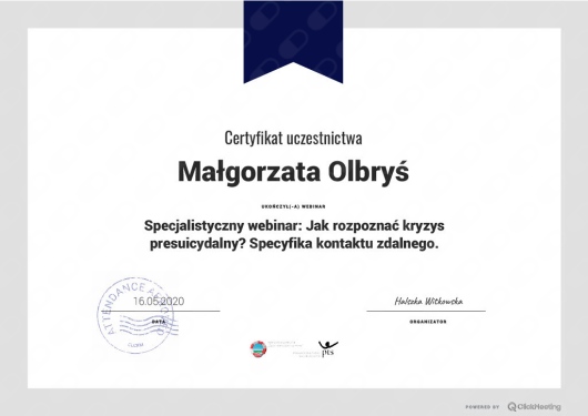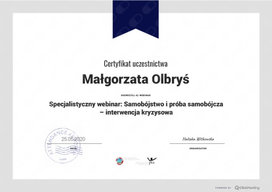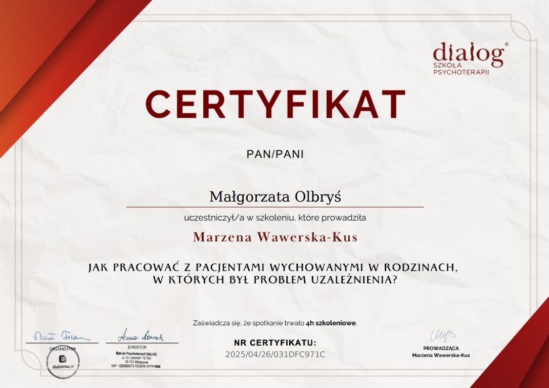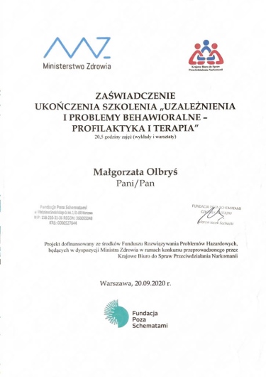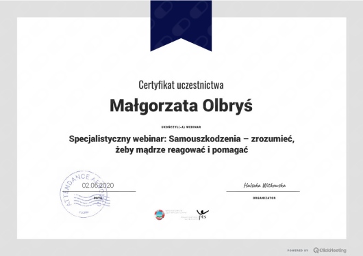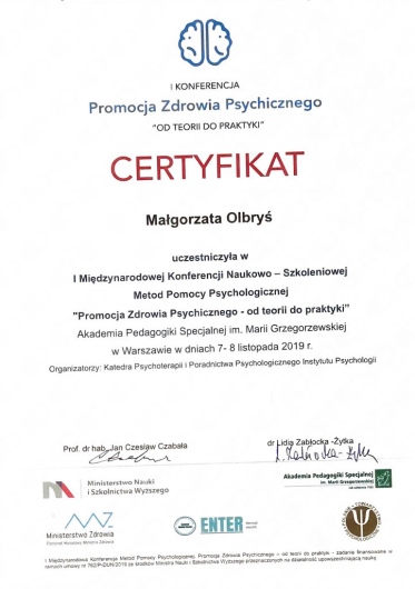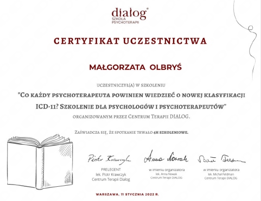Jaki jest zakres porad oferowanych przez Małgorzata Olbryś?Małgorzata Olbryś to psycholog. Na podstawie swojego doświadczenia i wykształcenia Małgorzata Olbryś oferuje usługi takie jak: Konsultacja psychologiczna, poradnictwo psychologiczne, interwencja kryzysowa, Badanie MMPI-2, Badanie ACE III, konsultacja online.