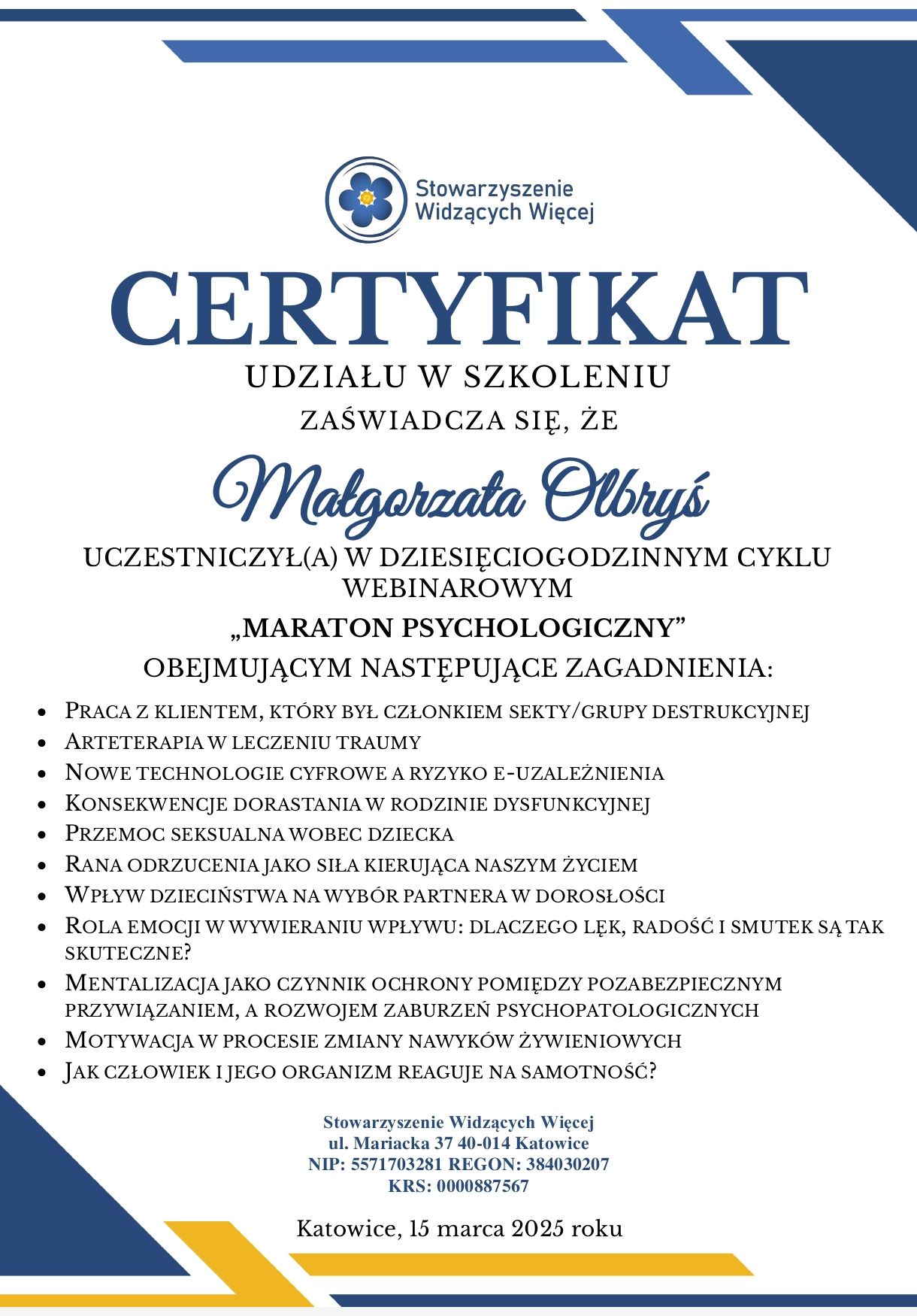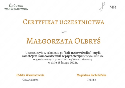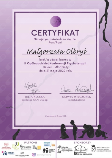 Z Panią Małgorzatą spotykam się od kilku miesięcy i widzę znaczną poprawę w radzeniu sobie z trudnymi sytuacjami. Jest cierpliwa, potrafi uważnie słuchać i tworzy atmosferę pełną zrozumienia. Emanuje spokojem i dobrą energią, dzięki czemu łatwiej jest mi się otworzyć. Wspólne sesje naprawdę dużo mi dają.