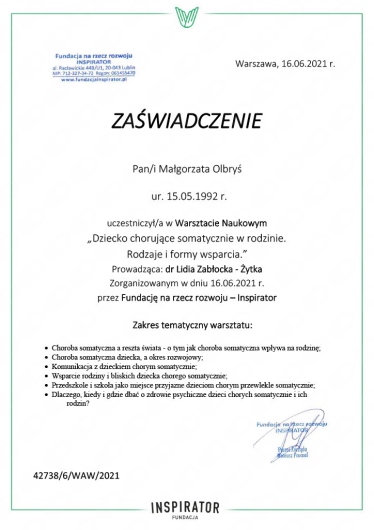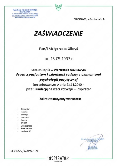 Stale rozwijam swoje umiejętności zawodowe, uczestnicząc w konferencjach oraz szkoleniach, aby zapewnić moim Pacjentom najwyższą jakość świadczonych usług. Jeśli zmagasz się z trudnościami i potrzebujesz wsparcia, zapraszam do skontaktowania się ze mną. Wspólnie znajdziemy drogę do lepszego samopoczucia i wyższej jakości życia.