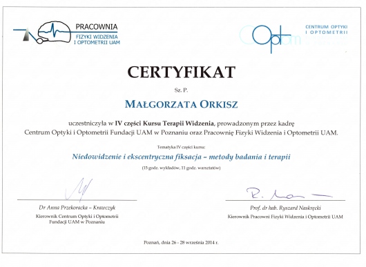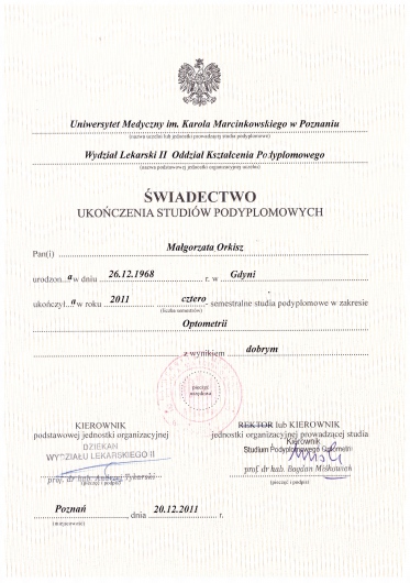 Ukończyłam optometrię na Uniwersytecie Medycznym w Poznaniu w 2011 roku.
