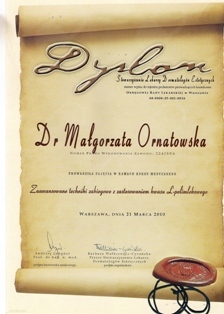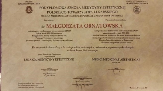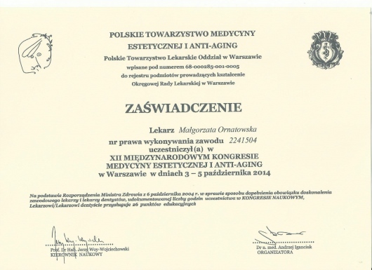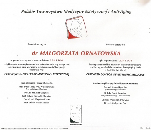 Polskie Towarzystwo Lekarskie za całokształt pracy, ciągłą edukacje i pracę szkoleniową nadało mi tytuł „ Certyfikowany Lekarz Medycyny Estetycznej”- nr 22 w Polsce.