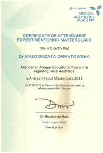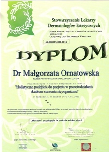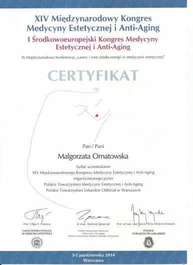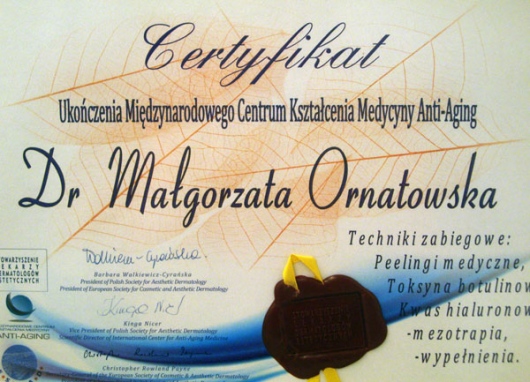 Po odbyciu serii szkoleń w Polskim i Europejskim Stowarzyszeniu Dermatologów Estetycznych uzyskałam tytuł „ Master in AA and Aesthetic Medicine”.