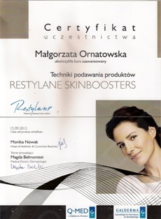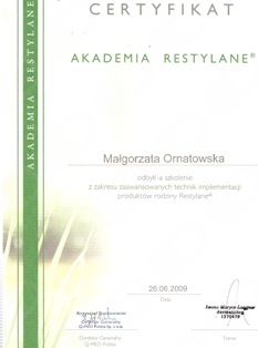 Jestem jedynym lekarzem posiadającym taki tytuł w Małopolsce. Posiadam tytuł Ambasadora marki Restylane nadany mi w roku 2008. Uczestniczyłam w ponad 400 i regularnie uczestniczę w kursach szkoleniowych z zakresu medycyny estetycznej, prowadzonych przez najlepszych lekarzy z całego świata. Odbyłam praktyki z zakresu wykonywania zabiegów estetycznych u takich międzynarodowych sław jak: