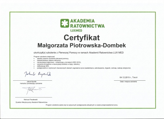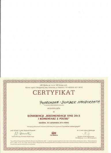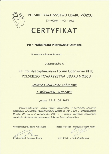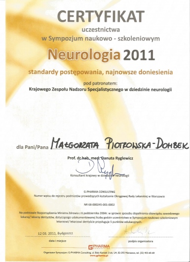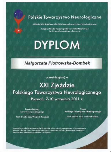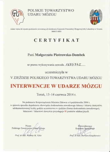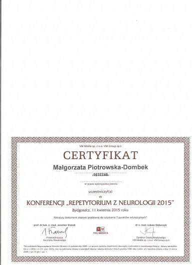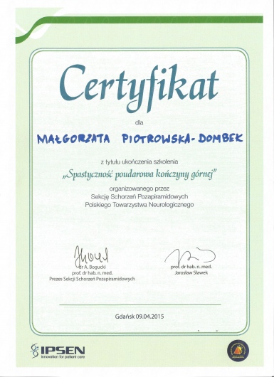 Od 2011r pracuję również z pacjentami w stanie apalicznym w Zakładzie Opiekuńczo-Leczniczym Fundacji 'Światło' w Toruniu. Posiadam certyfikaty z zastosowania toksyny botulinowej w leczeniu spastyczności i dystonii ogniskowych. Prywatnie jestem przede wszystkim mamą mojej córki Julii. Bardzo lubię podróże, taniec i jazdę konną.