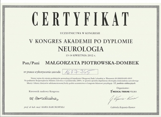 Jaki jest zakres porad oferowanych przez Małgorzata Piotrowska - Dombek?Małgorzata Piotrowska - Dombek to neurolog. Na podstawie swojego doświadczenia i wykształcenia Małgorzata Piotrowska - Dombek oferuje usługi takie jak: Konsultacja neurologiczna, Konsultacja telefoniczna - Neurolog, kwalifikacja do zabiegu leczenia migreny przewlekłej przy pomocy toksyny botulinowej, Leczenie migreny przy pomocy toksyny botulinowej, konsultacja online.