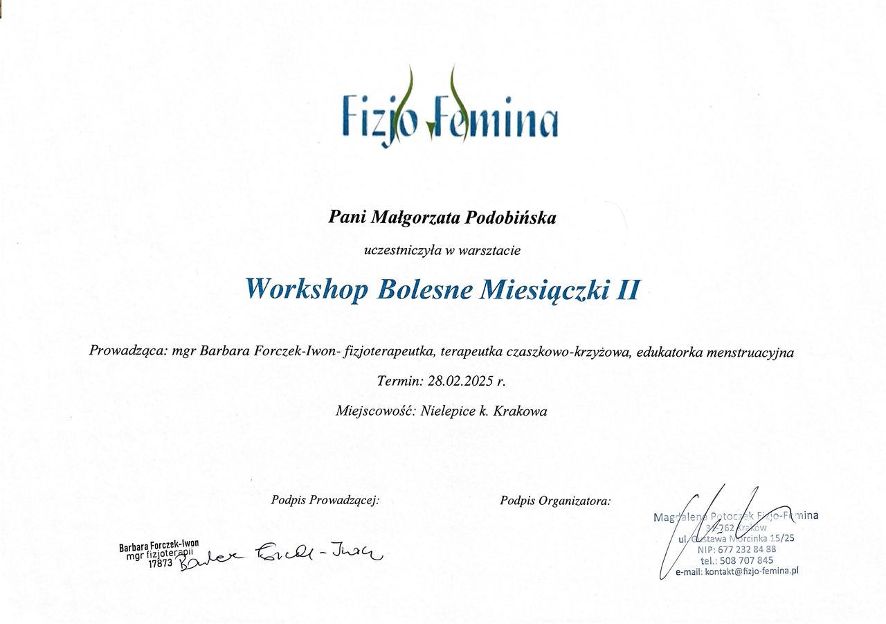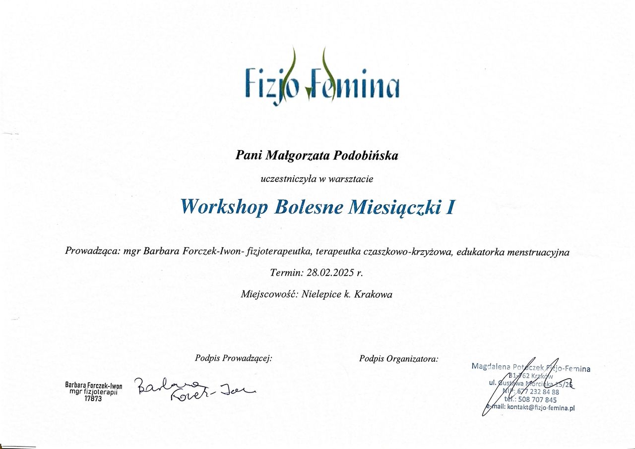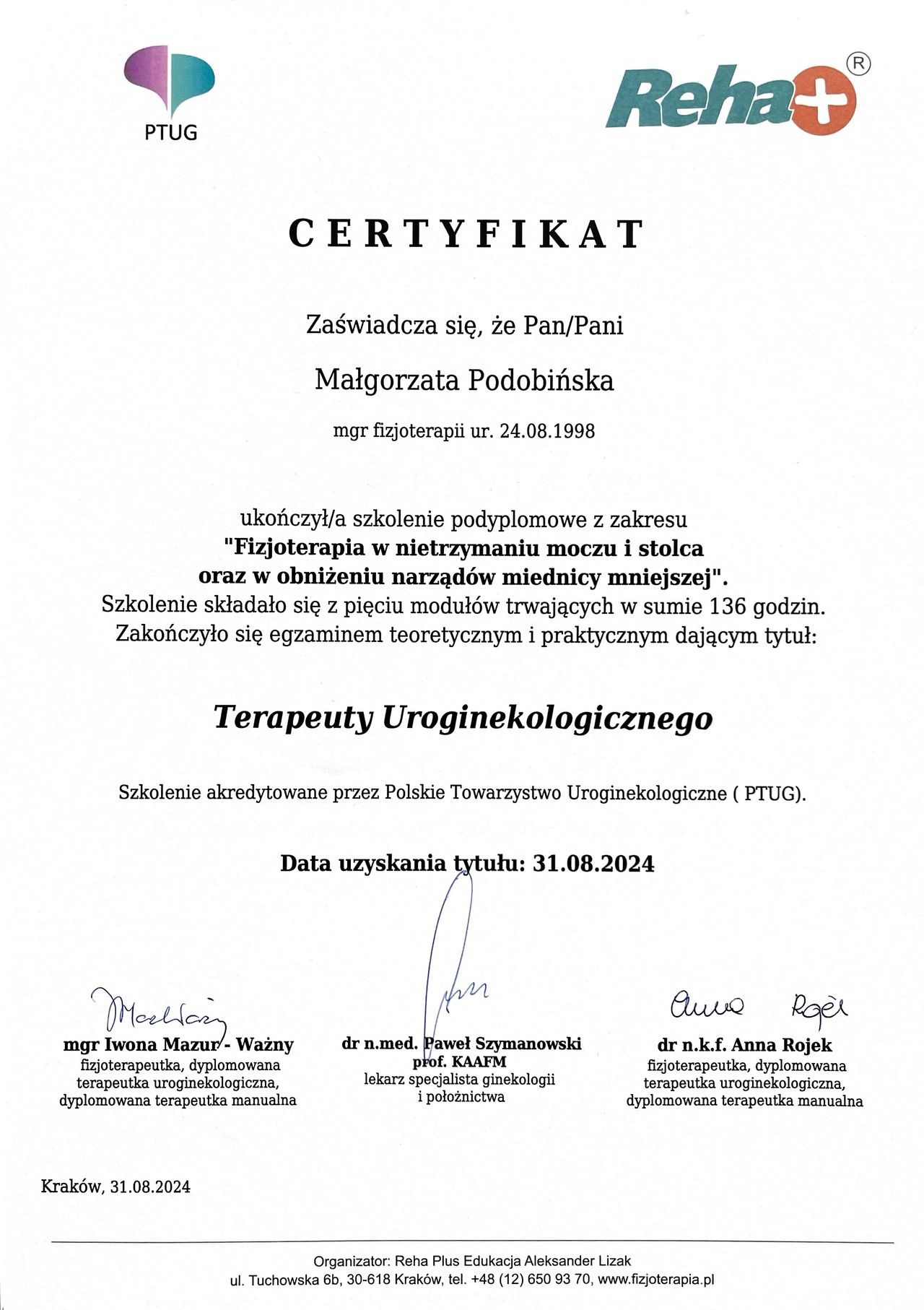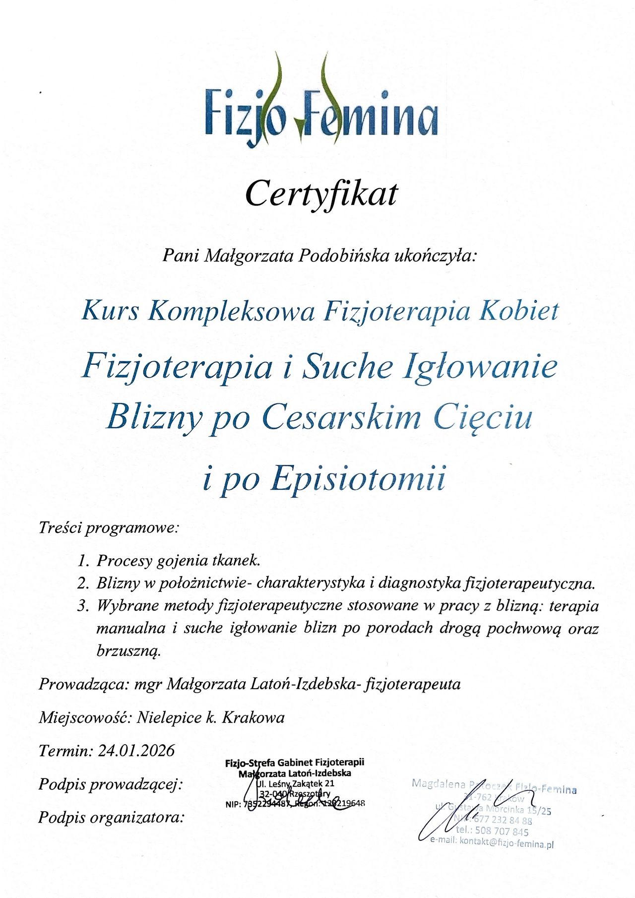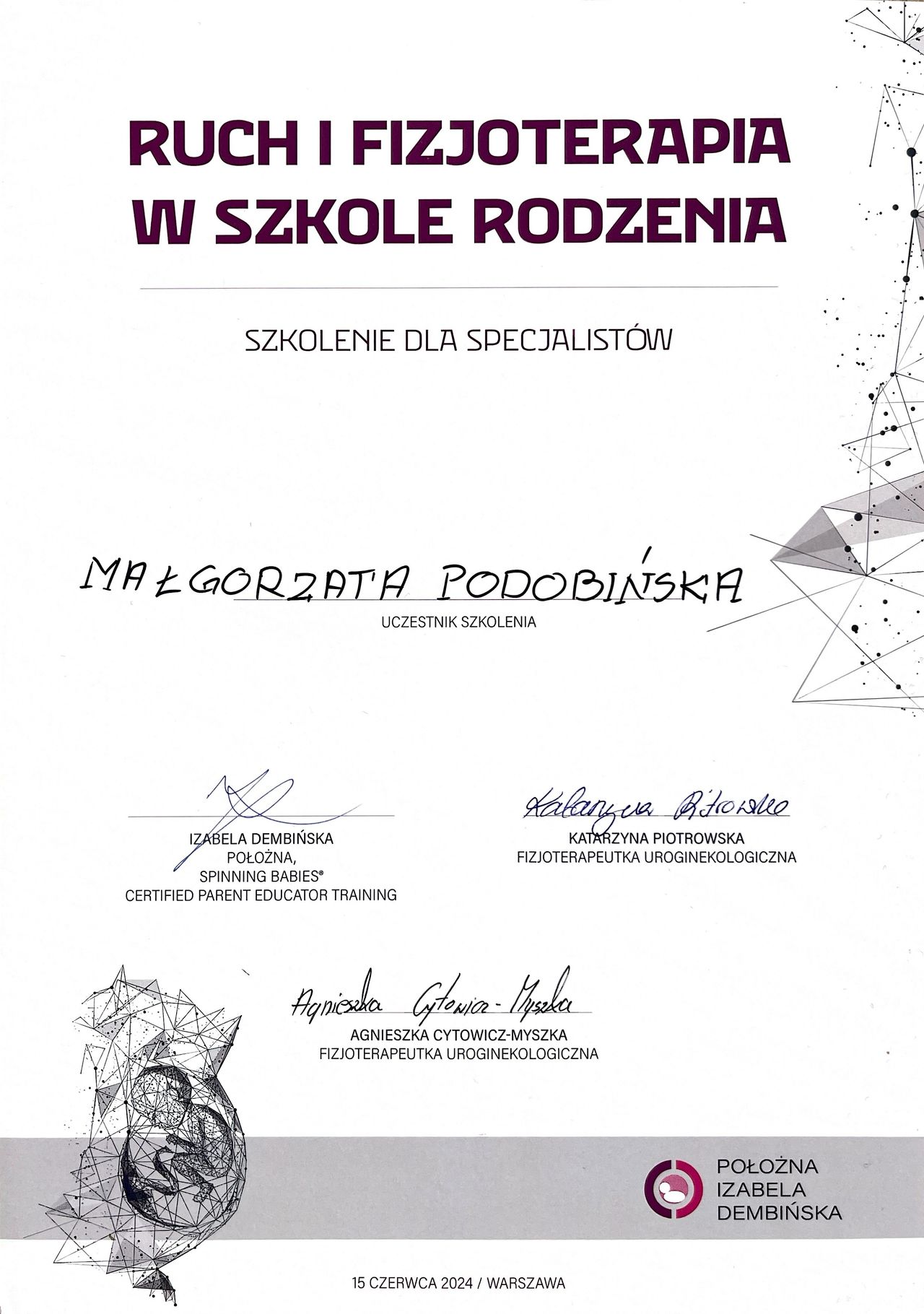 Jaki jest zakres porad oferowanych przez Małgorzata Podobińska?Małgorzata Podobińska to fizjoterapeuta. Na podstawie swojego doświadczenia i wykształcenia Małgorzata Podobińska oferuje usługi takie jak: fizjoterapia uroginekologiczna, Wizyta uroginekologiczna z doborem pessara, masaż kobiet w ciąży, ćwiczenia w ciąży, konsultacja okołoporodowa, Drenaż limfatyczny, Terapia blizny, Terapia blizny po cesarskim cięciu, masaż relaksacyjny.
