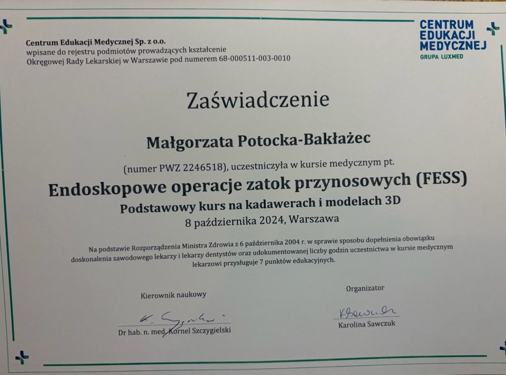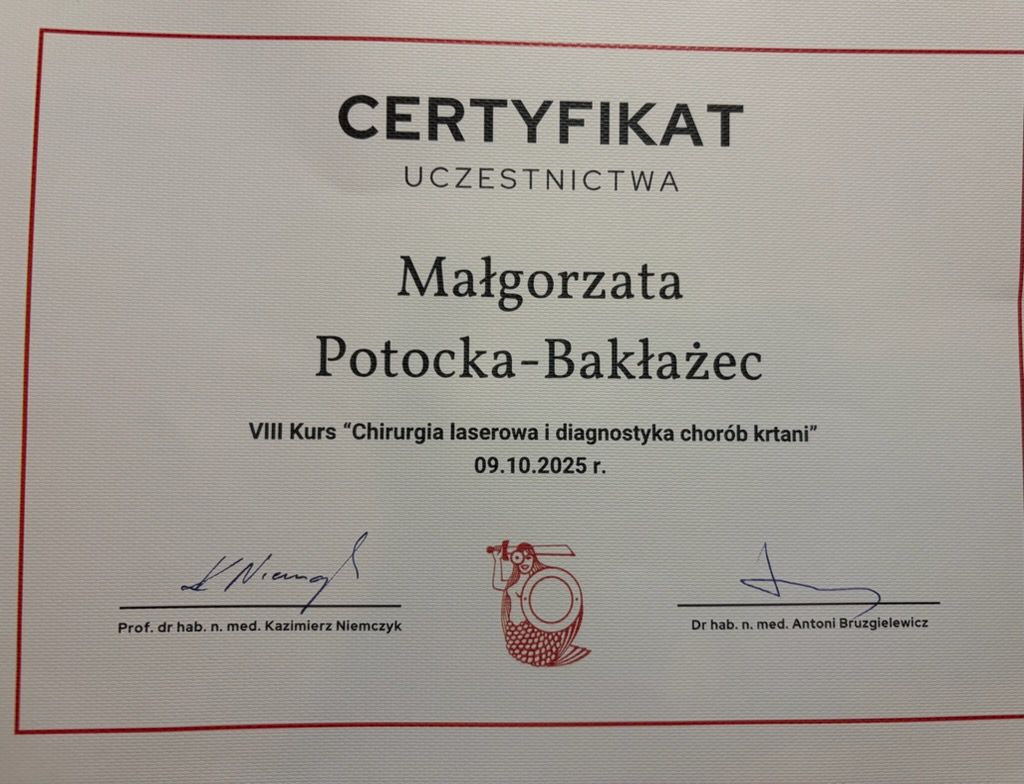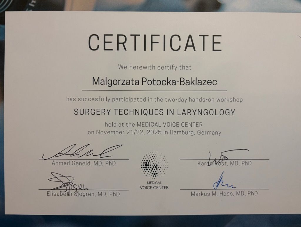 laryngologii dorosłych i dzieci. Wykonuje diagnostykę endoskopową w