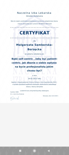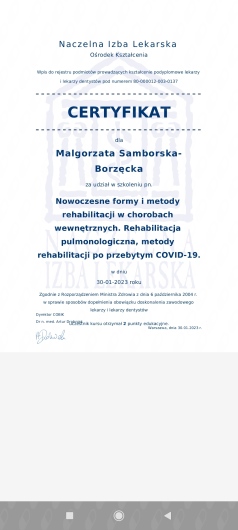 Jak Małgorzata Samborska-Borzęcka umawia wizyty?Małgorzata Samborska-Borzęcka używa kalendarza ZnanyLekarz, dlatego na stronie widzisz aktualne terminy. Wystarczy, że wybierzesz datę i godzinę, które odpowiadają Ci najbardziej. Umawianie wizyty jest darmowe, a tuż przed terminem wyślemy Ci przypomnienie.