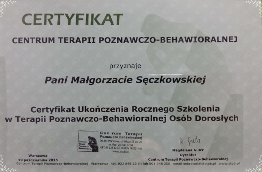 Pani Małgosia to wspaniały człowiek i doskonała profesjonalistka. Nawet nie jestem w stanie powiedzieć, jak jesteśmy wdzięczni, że przyjęła nas w trudnym momencie, kiedy świat się zawalił i nie wiedzieliśmy już czego się złapać... Moja córka była pod jej psychoterapeutyczną opieką przez 2,5 roku. Wyprowadziła ją z naprawdę z trudnej sytuacji, i jej i nasze życie wygląda teraz zupełnie inaczej. Powoli, systematycznie, dzień po dniu i spotkanie po spotkaniu, w odpowiednim czasie i tempie. Córka bardzo lubiła sesje z Panią Małgosią i zaufała jej w każdym calu - to najważniejsze. Opłaciło się i cieszę się, że los zesłał nam Panią Małgosię a ona odpisała na wiadomość i rozpoczęła pracę z córką, pomimo nawału pracy i innych pacjentów. Polecam zdecydowanie!