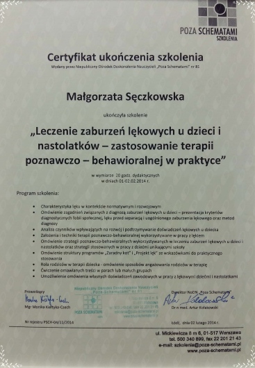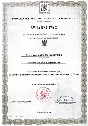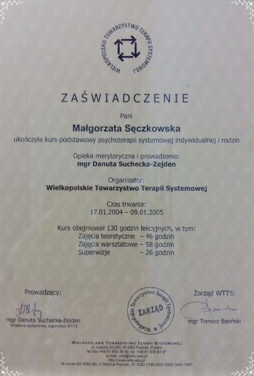 Jestem certyfikowanym psychoterapeutą (Certyfikat PTTPB nr 2043), seksuologiem, magistrem psychologii o specjalności psychologia kliniczna i rodziny. Od kilkunastu lat pracuję terapeutycznie z młodzieżą, dorosłymi i całymi rodzinami. Prowadzę także praktykę jako seksuolog. Mój gabinet zlokalizowany jest blisko centrum, z dogodnym dojazdem i dużym parkingiem. Poniżej opisuję moje kwalifikacje i doświadczenie zawodowe. Zapraszam również na stronę internetową mojego gabinetu Należę do organizacji zrzeszających psychoterapeutów jako: - Członek Polskiego Towarzystwa Seksuologicznego - Członek Polskiego Towarzystwo Psychiatrycznego - Sekcja Naukowa Psychoterapii. - Członek Wielkopolskiego Towarzystwa Terapii Systemowej. - Członek Polskiego Towarzystwa Terapii Poznawczej i Behawioralnej Wykształcenie zdobyłam na Uniwersytecie Łódzkim kończąc kierunek: Psychologia Stosowana o specjalizacji Psychologia Kliniczna i Psychologia Rodziny. Ponadto ukończyłam studia podyplomowe na Uniwersytecie im. Adama Mickiewicza w Poznaniu na kierunku: Seksuologia Kliniczna Wykształcenie akademickie regularnie uzupełniam specjalistycznymi kursami i szkoleniami organizowanymi przez uznane ośrodki kształcenia psychoterapeutów m.in.: Centrum Terapii Poznawczo-Behawioralnej Szkolenie z zakresu Terapii Poznawczo - Behawioralnej Zaburzeń u Osób Dorosłych "Poza Schematami" Kurs "Leczenie zaburzeń lękowych u dzieci i nastolatków – zastosowanie terapii poznawczo-behawioralnej w praktyce" Wielkopolskie Towarzystwo Terapii Systemowej Kurs dla zaawansowanych terapii systemowej rodzin, małżeńskiej, indywidualnej i grupowej Kurs podstawowy terapii systemowej rodzin, małżeńskiej, indywidualnej i grupowej Superwizje Doświadczenia własne Polski Instytut Ericsonowski Terapia ofiar i sprawców przemocy Diagnoza w psychoterapii Instytut Psychologii Zdrowia PTP - Szkoła Trenerów Udział w wielu konferencjach i spotkaniach naukowych Oprócz wykształcenia od kilkunastu lat poszerzam swoje doświadczenie pracując m.in. w takich miejscach jak: GRADIAM - Gabinet Psychologii i Psychoterapii - prywatna praktyka psychoterapeutyczna i psychologiczna Publiczne Gimnazjum z Oddziałami Integracyjnymi - prowadzenie zajęć terapeutycznych indywidualnych i w grupie - prowadzenie zajęć warsztatowych - porady dla rodziców - opieka nad dziećmi niepełnosprawnymi i chorymi Poradnia Zdrowia Psychicznego dla Dzieci - prowadzenie terapii rodzinnej w nurcie systemowym - prowadzenie terapii indywidualnej - porady Szpital Psychiatryczny ZOZ, Oddział Dzienny - diagnoza kliniczna i psychiatryczna - sporządzanie opinii psychologicznych - prowadzenie zajęć relaksacyjnych - współprowadzenie zajęć terapeutycznych - współprowadzenie zajęć edukacyjnych Klinika Psychiatrii Wieku Podeszłego i Zaburzeń Psychotycznych Uniwersytetu Medycznego w Łodzi, Oddział Dzienny „S” - współprowadzenie grupy terapeutycznej - udział w społecznościach oddziału - rozmowy wspierające z pacjentami - prowadzenie zajęć relaksacyjnych Poradnia Psychologiczno-Pedagogiczna nr 2 - diagnoza psychologiczna - współprowadzenie terapii rodzin - prowadzenie zajęć wspierających rozwój wg autorskiego programu Odbyłam staże i praktyki m.in. w: MOW nr 1 MOPS Wydział Wspierania Pieczy Zastępczej Fundacja Pomocy Rodzinie OPOKA MOS „SOS” nr 1 Poradnia Psychologiczna NZOZ Gajusz przy oddziałach onkologicznych dziecięcych Uniwersyteckiego Szpitala Klinicznego nr 4 Poradnia Zdrowia Psychicznego (Lniana 2) Dom Dziecka nr 5 w Łodzi Prywatnie jestem szczęśliwą mężatką i mamą. Uwielbiam czytać, szczególnie kryminały. Pasjonuje mnie profilowanie psychologiczne. Wolny czas spędzam z rodziną.