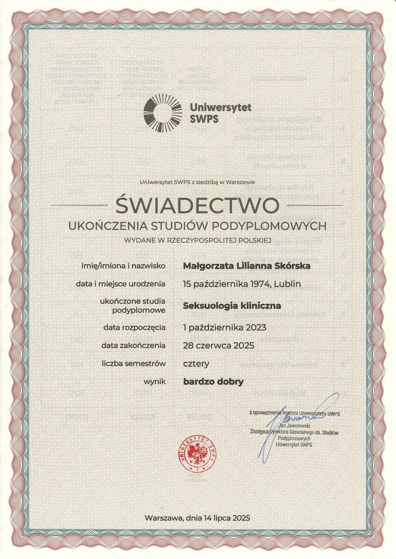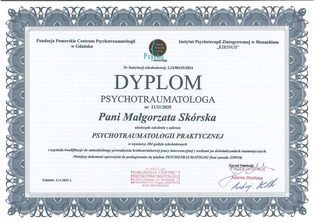 Z dumą informuję, że ukończyłam szkolenie w Fundacji Pomorskiego Centrum Psychotraumatologii w Gdańsku oraz w Instytucie Psychoterapii Zintegrowanej w Monachium i uzyskałam tytuł Psychotraumatologa.
