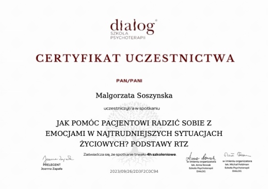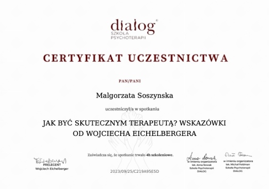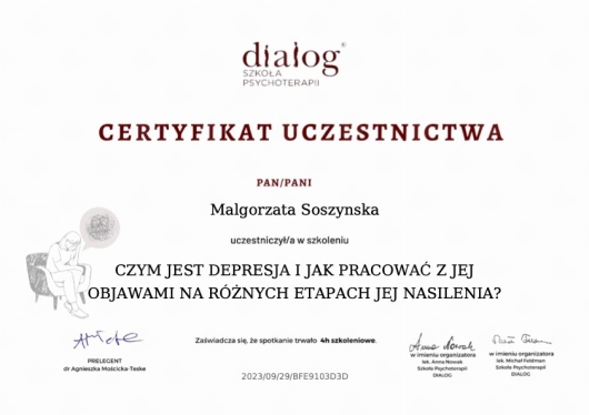 Jaki jest zakres porad oferowanych przez Małgorzata Soszyńska?Małgorzata Soszyńska to psycholog. Na podstawie swojego doświadczenia i wykształcenia Małgorzata Soszyńska oferuje usługi takie jak: terapia krótkoterminowa TSR, Terapia psychologiczna, terapia TSR, poradnictwo psychologiczne, Konsultacja psychologiczna, konsultacja online.