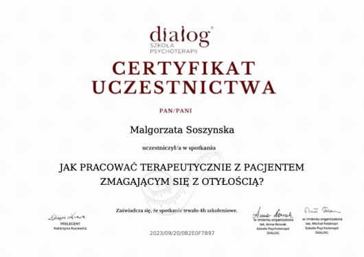Jak Małgorzata Soszyńska umawia wizyty?Małgorzata Soszyńska używa kalendarza ZnanyLekarz, dlatego na stronie widzisz aktualne terminy. Wystarczy, że wybierzesz datę i godzinę, które odpowiadają Ci najbardziej. Umawianie wizyty jest darmowe, a tuż przed terminem wyślemy Ci przypomnienie.