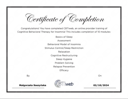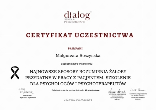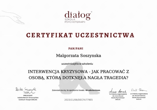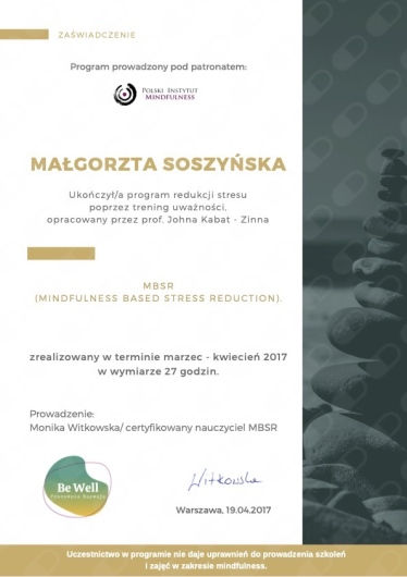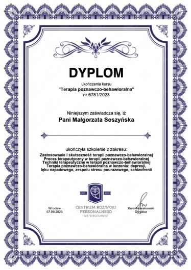 Jestem psychologiem, 5 letnie jednolite studia ukończyłam na Uniwersytecie Łódzkim, dalej pogłębiam moją wiedzę dotyczącą psychoterapii w toku 4-letniego szkolenia psychoterapeutycznego w Szkole Psychoterapii Dialog akredytowanej przez Polskie Towarzystwo Psychiatryczne. Poprzez unikatowe połączenie 15-letniego doświadczenia pracy w biznesie w firmach Accenture, Danone, Mars, wykształcenia psychologicznego i praktyki terapeutycznej jestem w stanie skutecznie pomagać pracownikom korporacji, specjalistom, managerom i kadrze zarządzającej. Dzięki własnemu doświadczeniu pracy od praktykanta po Kierownika na szczeblu Europejskim dobrze rozumiem wyzwania psychiczne jakie stawia przed pracownikiem międzynarodowa korporacja. Jeżeli cierpisz bo czujesz się jak niewiele znaczący trybik w maszynie, brakuje Ci motywacji, jesteś ofiarą mobbingu, masz zaburzenia depresyjne, obniżonego nastroju ze względu na ilość obowiązków, czujesz się przemęczony, masz problemy ze snem, czujesz się wypalony zawodowo, doświadczasz nadmiarowego stresu, masz stany lękowe związane z Twoimi obowiązkami w pracy, masz niskie poczucie własnej wartości, kompetencji, masz trudności z zachowaniem równowagi pomiędzy życiem prywatnym, a zawodowym / work-life balance, masz tendencje perfekcjonistyczne lub odczuwasz brak satysfakcji z życia, ja to rozumiem, zapraszam do rozmowy, do wspólnego budowania rozwiązań w kontekście zdefiniowanych w czasie sesji celów. W pracy z klientem wierzę w indywidualne podejście, dopasowane do potrzeb i gotowości osoby na danym etapie terapii. Pracuję w nurcie Terapii Krótkoterminowej Skoncentrowanej na Rozwiązaniach TSR, czasem sięgam po techniki zaczerpnięte z nurtu Terapii Poznawczo-Behawioralnej. Regularnie poszerzam kompetencje psychologiczne i terapeutyczne poprzez liczne szkolenia, kursy i literaturę fachową, by móc na bieżąco dostosowywać metody pomocy psychologicznej do najnowszych standardów. Kurs Terapii Skoncentrowanej na Rozwiązaniach ukończyłam w rekomendowanej przez PSTTSR szkole CTSR w wersji (Poziom Podstawowy i Zaawansowany). Jestem również członkiem Polskiego Stowarzyszenia Terapeutów Terapii Skoncentrowanej na Rozwiązaniach PSTTSR. Odbyłam certyfikowane szkolenia między innymi CBT for Insomnia - Kurs Terapii Poznawczo - Behawioralnej w leczeniu bezsenności, z Mindfulness Based Stress Reduction Therapy w Polskim Instytucie Mindfulness POLIM, Pierwszej pomocy psychologicznej, Interwencji Kryzysowej, Pomocy w Kryzysie Emocjonalnym, Pomocy w radzeniu sobie ze stratą/żałobą. Doświadczenie poza praktyką własną, czerpię z wieloletniej pracy na stanowiskach kierowniczych w międzynarodowej korporacji, z prowadzenia wsparcia psychologicznego i terapii krótkoterminowej w nurcie TSR w firmach Mental Benefits oraz Lyra (były ICAS). Dedykuję również kilka godzin mojej pracy jako wsparcie dla osób w potrzebie w ramach Fundacji Niepodzielni. Pracuję zgodnie z Kodeksem Etycznym Psychologa Polskiego Towarzystwa Psychologicznego, moją pracę poddaję regularnej superwizji. Zapraszam serdecznie do spotkania.