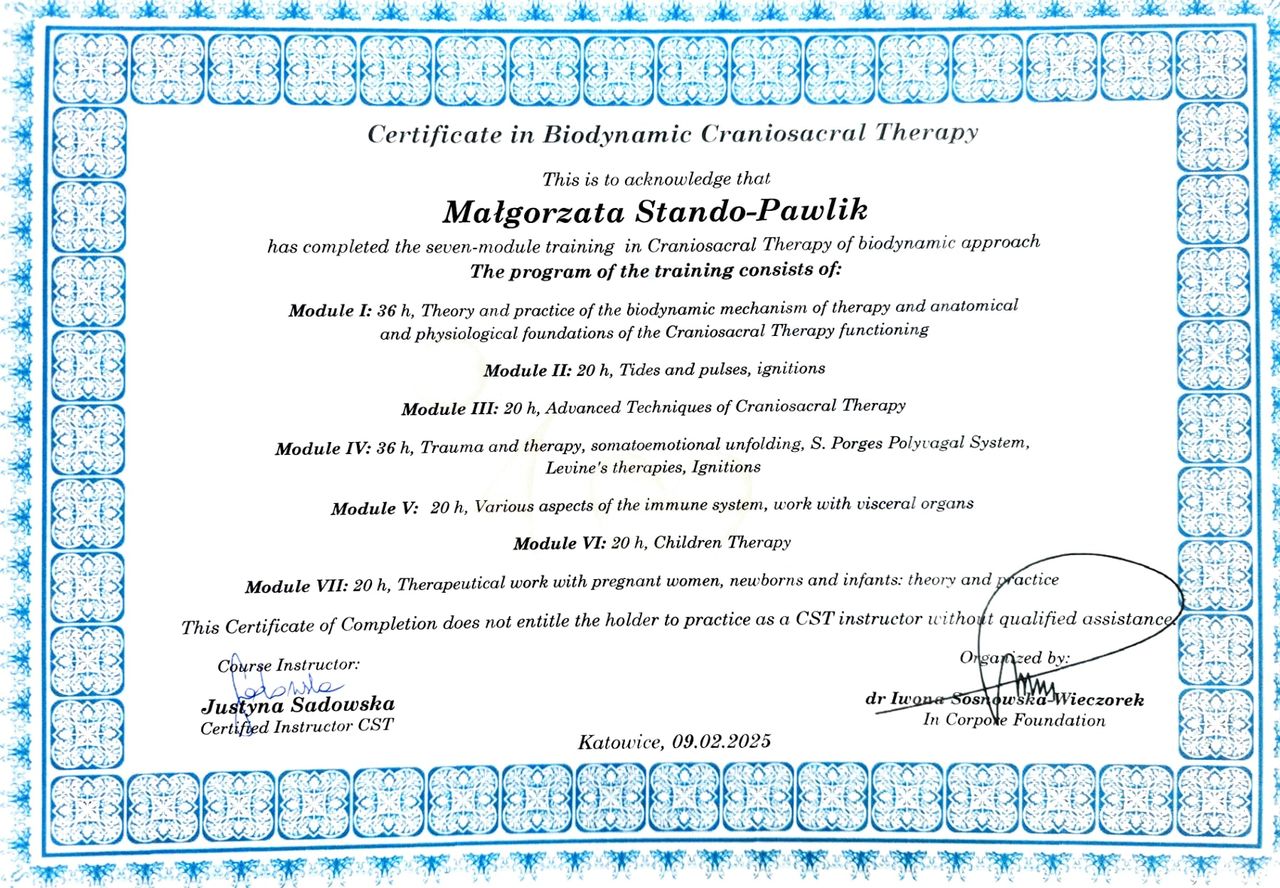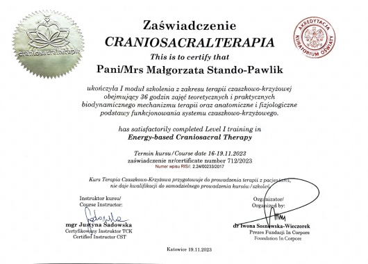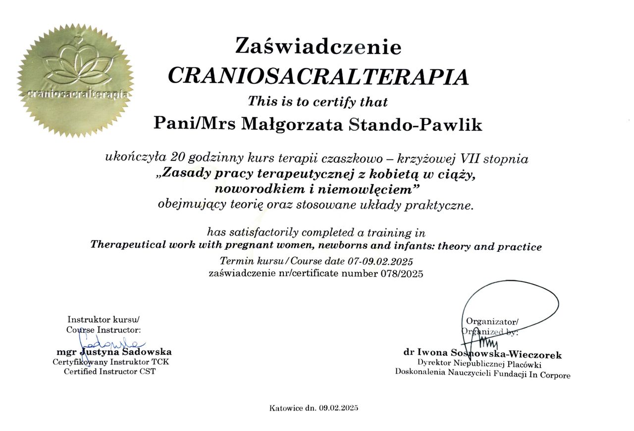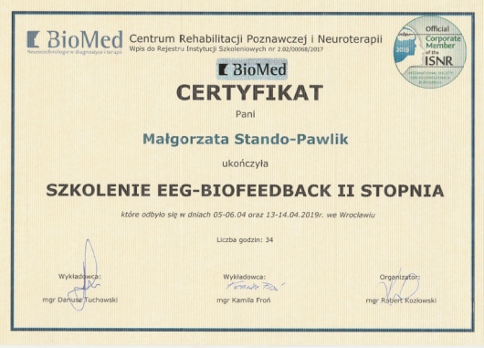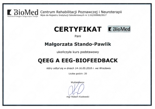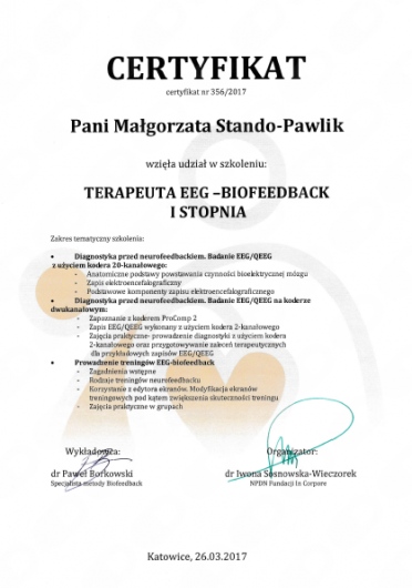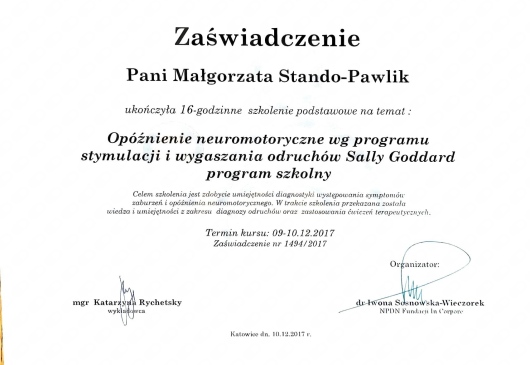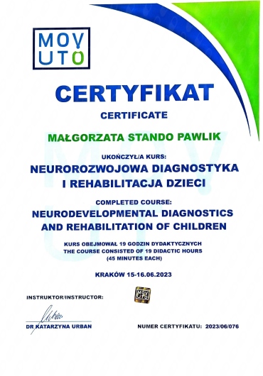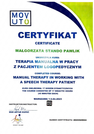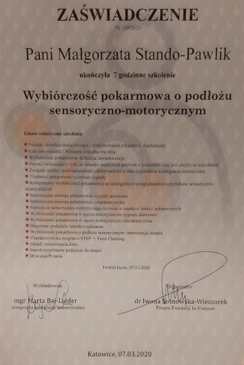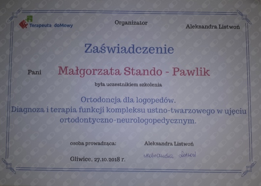 Jestem neurologopedą pediatrycznym, Terapeutą Ortodoncji Funkcjonalnej, Terapeutą Czaszkowo- Krzyżowym i terapeutą karmienia. Specjalizuję się w pracy z dziećmi z trudnościami w nabywaniu umiejętności jedzenia od pierwszych dni życia, w tym z wybiórczością pokarmową, zaburzeniami funkcji oddychania (np. oddychanie ustami), w obrębie twarzy i jamy ustnej, w rozwoju mowy i wymowy tj. wcześniaki, dziećmi po cesarskim cięciu, z podwyższonym lub obniżonym napięciem mięśniowym, po komplikacjach ciążowych i okołoporodowych.
