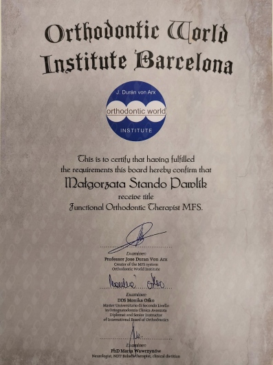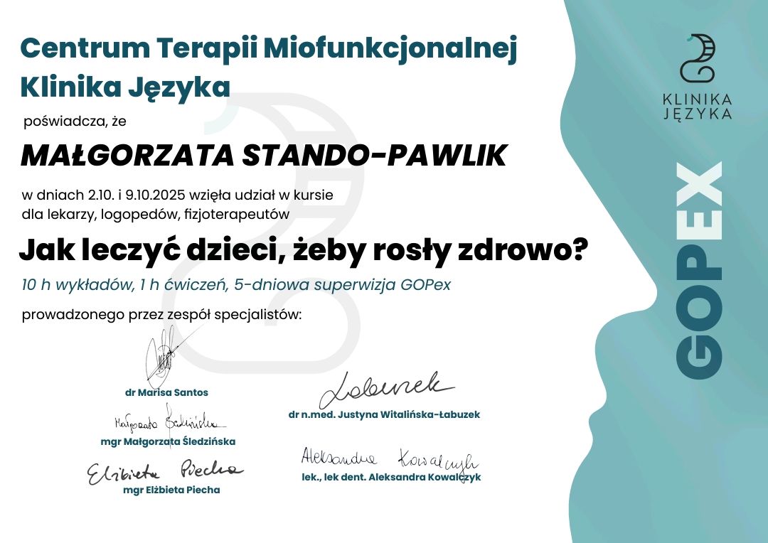 Współpracuję z ortodontami i fizjoterapeutami/osteopatami w celu wspierania leczenia ortodontycznego. Przygotowuję również pacjentów pod względem funkcji i równowagi mięśniowej do rozpoczęcia terapii ortodontycznej. Jedną z wykorzystywanych przeze mnie metod w tym celu jest GOPEX.