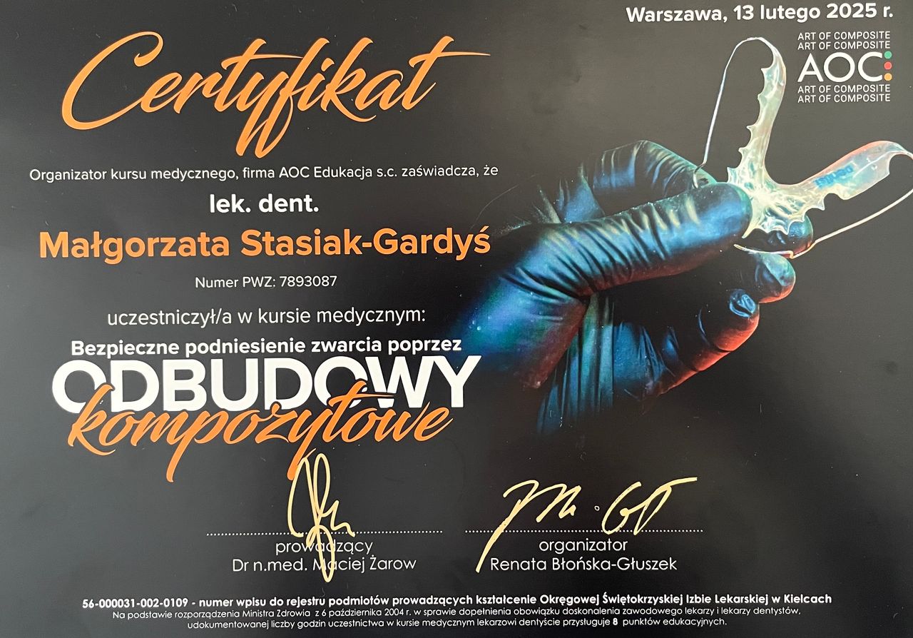 Jaki jest zakres porad oferowanych przez Małgorzata Stasiak-Gardyś?Małgorzata Stasiak-Gardyś to stomatolog. Na podstawie swojego doświadczenia i wykształcenia Małgorzata Stasiak-Gardyś oferuje usługi takie jak: stomatologia estetyczna, chirurgia stomatologiczna, usuwanie zębów, leczenie kanałowe, leczenie próchnicy, protezy, korony pełnoceramiczne, fluoryzacja zębów, odbudowa zębów, badania stomatologiczne.