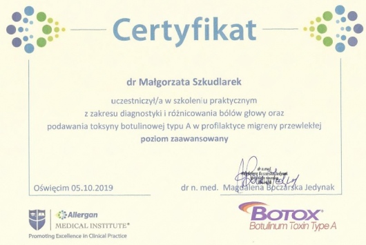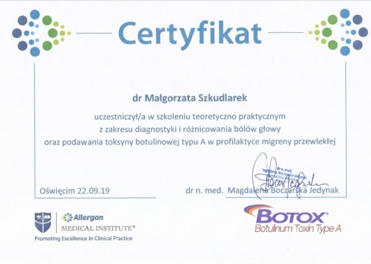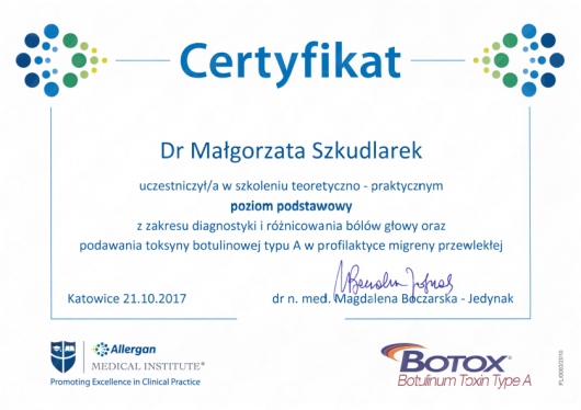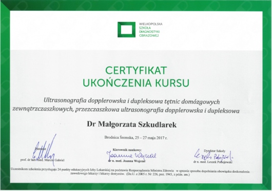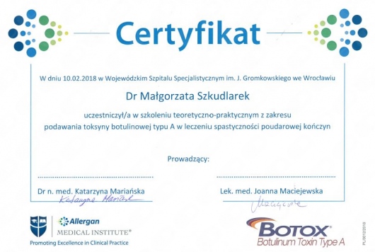 Szczególnie interesuję się rozwojem układu nerwowego, elektroencefalografią oraz nowoczesnymi technikami stymulacji mózgu. Stale doskonalę swoją wiedzę uczestnicząc w konferencjach i zjazdach naukowych oraz kursach doskonalących. Ukończyłam m.in. kurs "USG- doppler tt domózgowych" oraz "EEG", obecnie uczestniczę w cyklu szkoleń nt. zastosowania toksyny botulinowej w neurologii: m.in.w leczeniu spastyczności poudarowej, migreny przewlekłej, dystonii (w tym kurczu powiek i połowiczego kurczu twarzy).