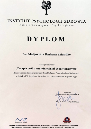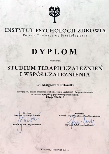 O mnie: Ukończyłam studia psychologiczne SWPS, 4-letnia szkołę Psychoterapii Integracyjnej Instytutu Psychologii Zdrowia, Studium Psychoterapii Uzależnień IPZ, szkolenie z zakresu prowadzenia procesu grupowego IPZ.