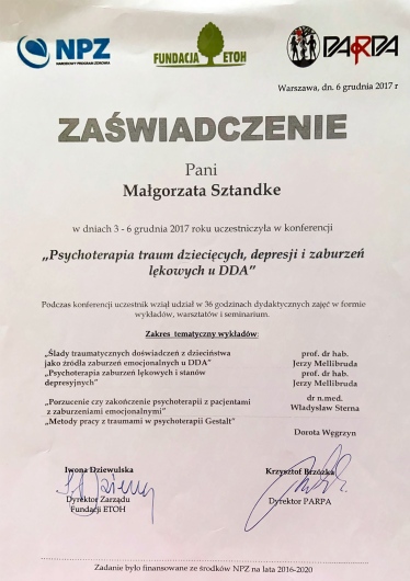 Uczestniczyłam w szkoleniach z rozwoju osobistego, procesu Integracji Doświadczeń Psychodelicznych, Oddychania Holotropowego, konferencjach związanych z psychoterapią DDA, cPTSD.