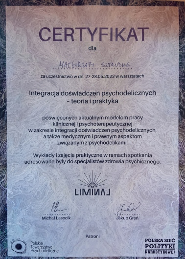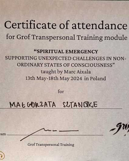Aktualnie jestem w trakcie Groff Transpersonal Training związanego z pracą z poszerzonymi stanami świadomości.