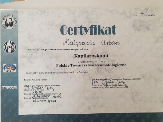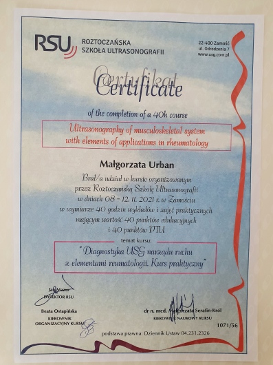 Szkolenie specjalizacyjne odbywałam w Oddziale Reumatologii i Chorób Wewnętrznych Dolnośląskiego Szpitala Specjalistycznego im. T.Marciniaka we Wrocławiu, gdzie pracuję do chwili obecnej. Jestem członkiem Dolnośląskiego i Polskiego Towarzystwa Reumatologicznego. Posiadam liczne certyfikaty z ultrasonografii w zakresie USG narządu ruchu oraz certyfikat z wykonywania kapilaroskopii. Dobro pacjenta jest moją nadrzędną wartością. Staram się podchodzić indywidualnie i holistycznie do każdego pacjenta. Stale poszerzam swoją wiedzę uczestnicząc w kursach, szkoleniach i konferencjach.