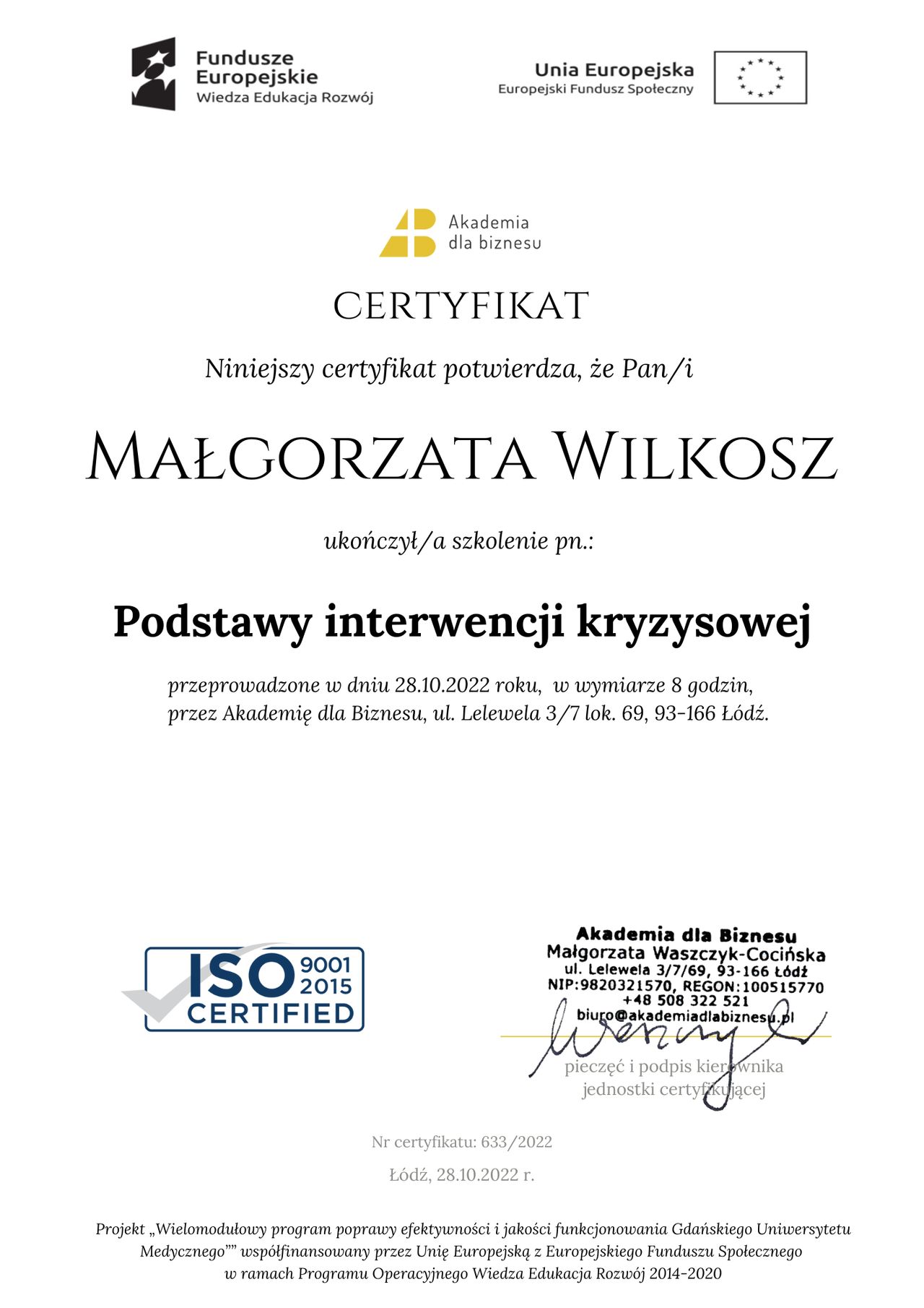 Ukończyłam jednolite studia magisterskie z psychologii oraz studia z psychotraumatologii. Jestem w trakcie całościowego, akredytowanego szkolenia psychoterapeutycznego w nurcie poznawczo-behawioralnym (CBT) w Instytucie Poznawczym. Pracuję również w poradni zdrowia psychicznego dla dzieci i młodzieży, a doświadczenie zdobywałam m.in. w Szpitalu Specjalistycznym w Kościerzynie oraz w Ośrodku Interwencji Kryzysowej.