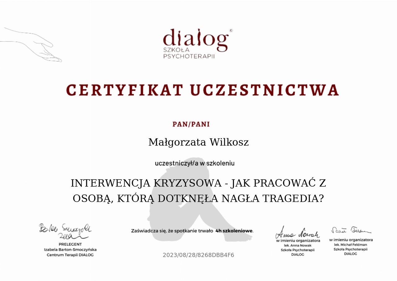 Regularnie podnoszę kwalifikacje, uczestniczę w szkoleniach i superwizjach. Jestem członkinią Polskiego Towarzystwa Terapii Poznawczej i Behawioralnej oraz pracuję zgodnie z zasadami kodeksu etycznego psychologa.