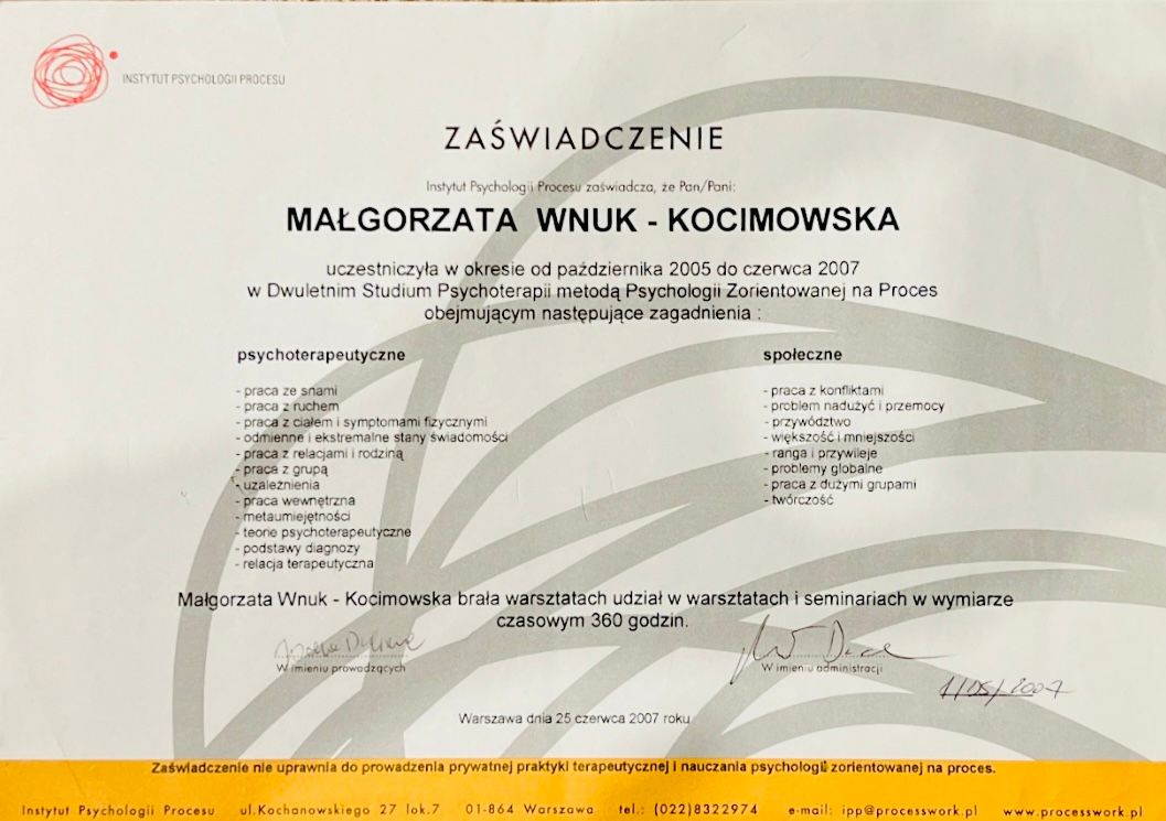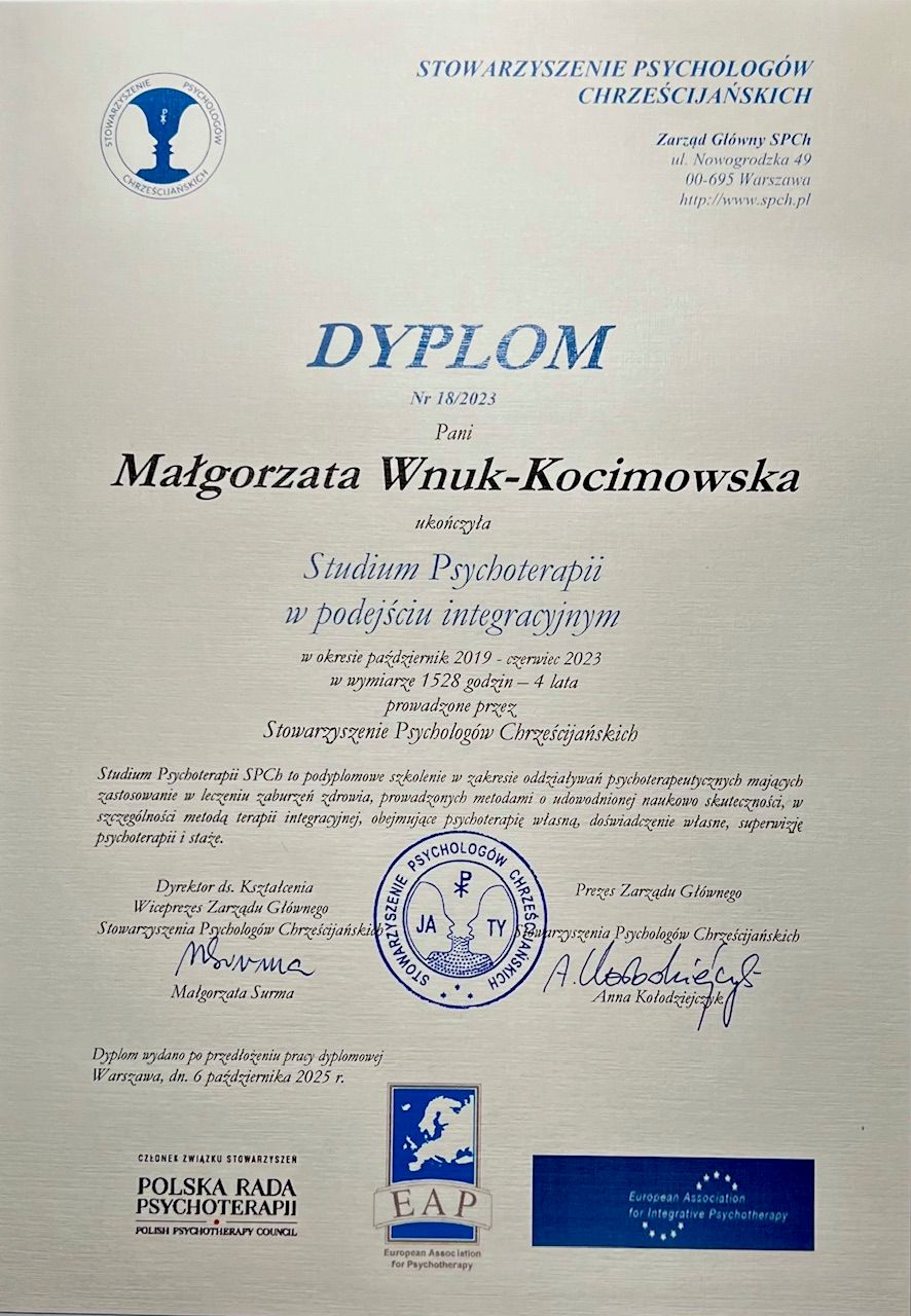 Ta praca jest też dla mnie ciągłą pracą nad sobą. Motywuje, mobilizuje i inspiruje zarazem. Na jakim etapie zawodowym jestem? Aktualnie przygotowuję się do procesu certyfikacji. Studia psychologiczne ukończyłam na UKSW. Realizowałam program dwóch kierunków: psychologii klinicznej i osobowości oraz wychowawczej i rozwojowej. Doświadczenie kliniczne zdobywałam pracując przez kilka lat na całodobowym psychiatrycznym oddziale klinicznym Szpitala Nowowiejskiego w Warszawie oraz w kilku poradniach. Prowadziłam również terapię krótkoterminową w ośrodku pomocy społecznej. Przez kilka lat uczyłam się psychoterapii zorientowanej na proces w IPP w Warszawie. Po zdaniu egzaminów I fazy pracowałam w tym nurcie pod superwizją, nadal szkoląc się. Uczestniczyłam w warsztatach nauczycieli polskich i zagranicznych, superwizji grupowej, terapii własnej. W tym okresie prowadziłam również warsztaty rozwojowe oraz współprowadziłam spotkania dotyczące tematów społecznych w ramach Centrum Dialogu Społecznego przy IPP. Na okres sześciu lat ze względów osobistych wycofałam się z życia zawodowego i zawiesiłam, a potem zrezygnowałam ze studiów. Sześć lat temu wróciłam ponownie do pracy oraz dalszego szkolenia. Podjęłam jednak decyzję o rozszerzeniu spojrzenia psychoterapeutycznego i rozpoczęłam naukę w Studium Psychoterapii SPCh. Dało mi ono między innymi umiejętność spojrzenia psychoterapeutycznego w paradygmacie psychodynamicznym i systemowym, ale też bardzo konkretne narzędzia pracy poznawczo - behawioralnej. Moim preferowanym nurtem jest jednak terapia schematu, którą doskonalę dalej po ukończeniu Studium. Program obu szkół psychoterapii, w których się uczyłam i uczę, jest zgodny ze standardami Polskiej Rady Psychoterapii.