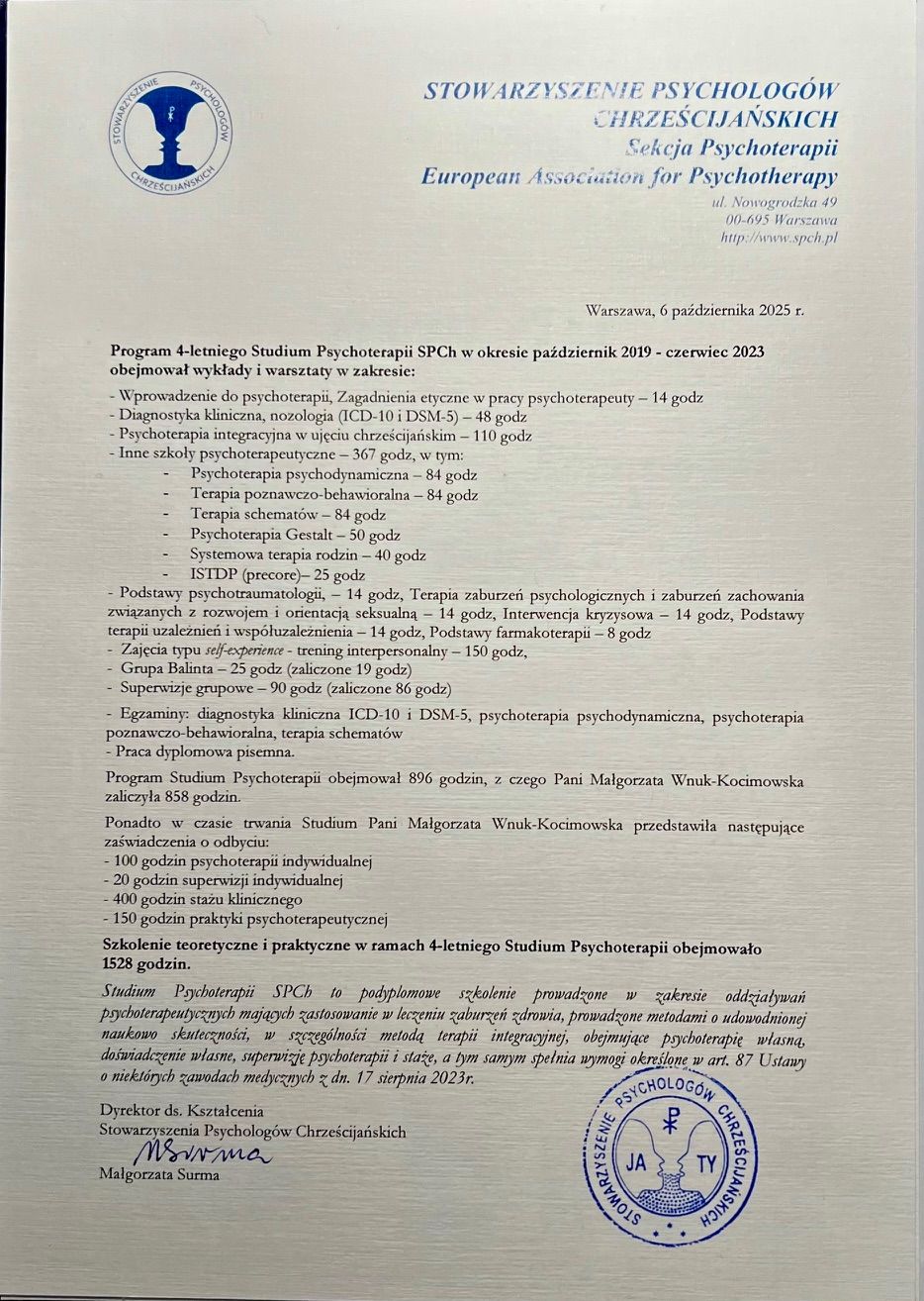 Szczerze polecam terapie z Pania Malgorzata Wnuk-Kocimowska, ktora krok po kroku, dzieki odpowiednim dla pacjenta metodom, wyprowadza go do swiata otwartych, pogodnych i osadzonych w sobie doroslych.