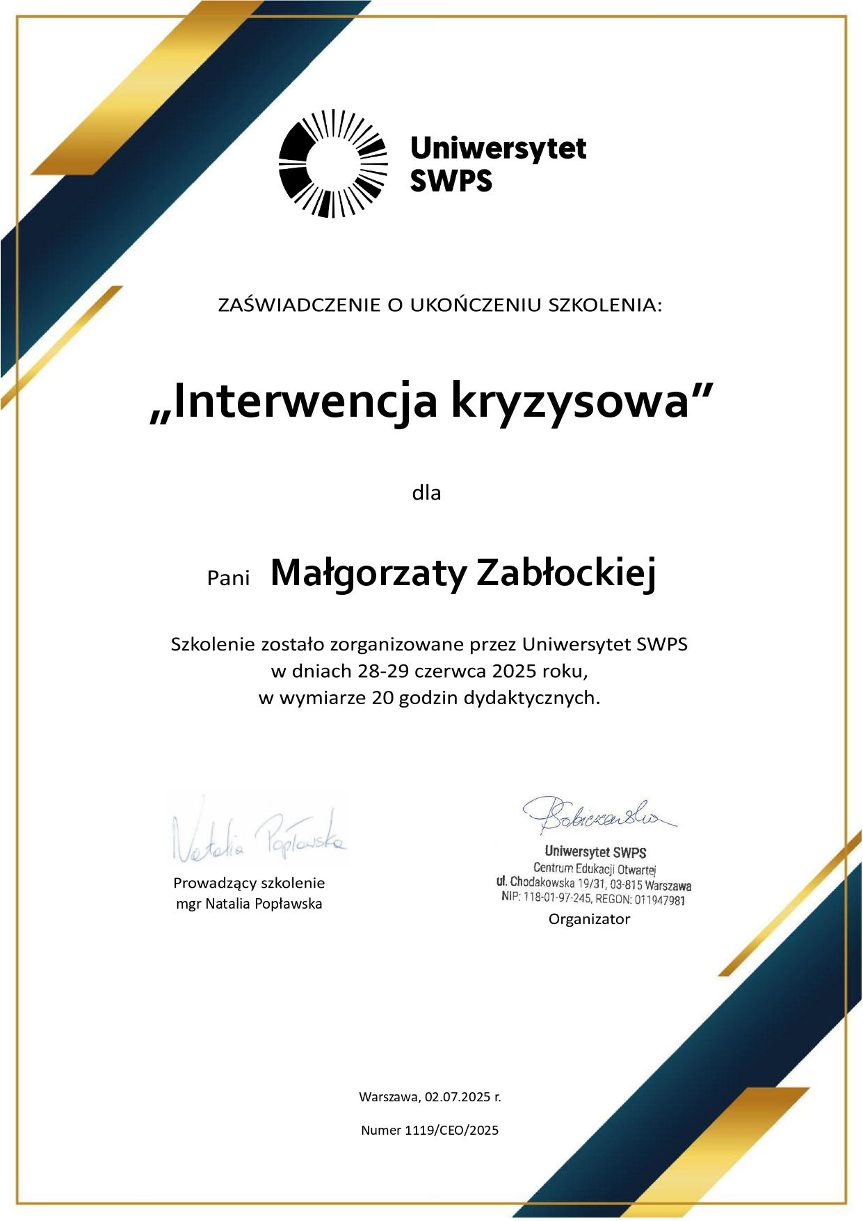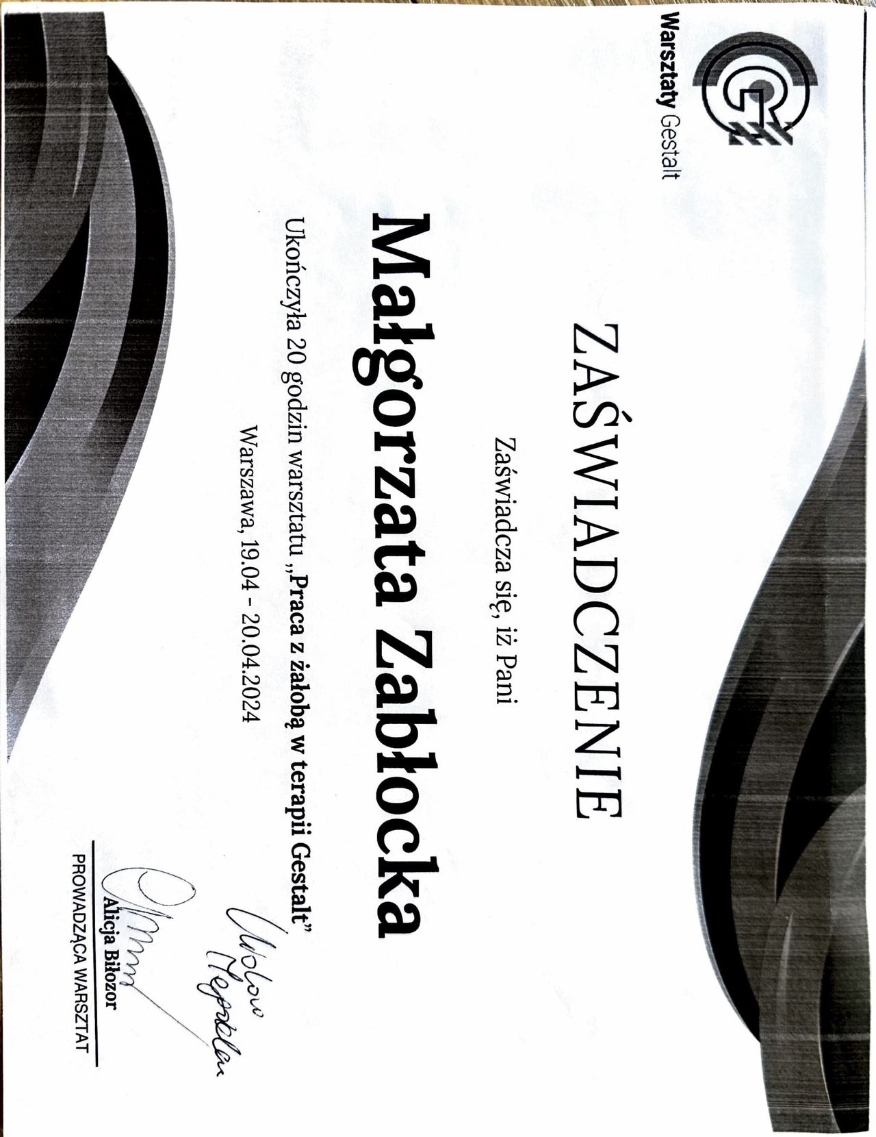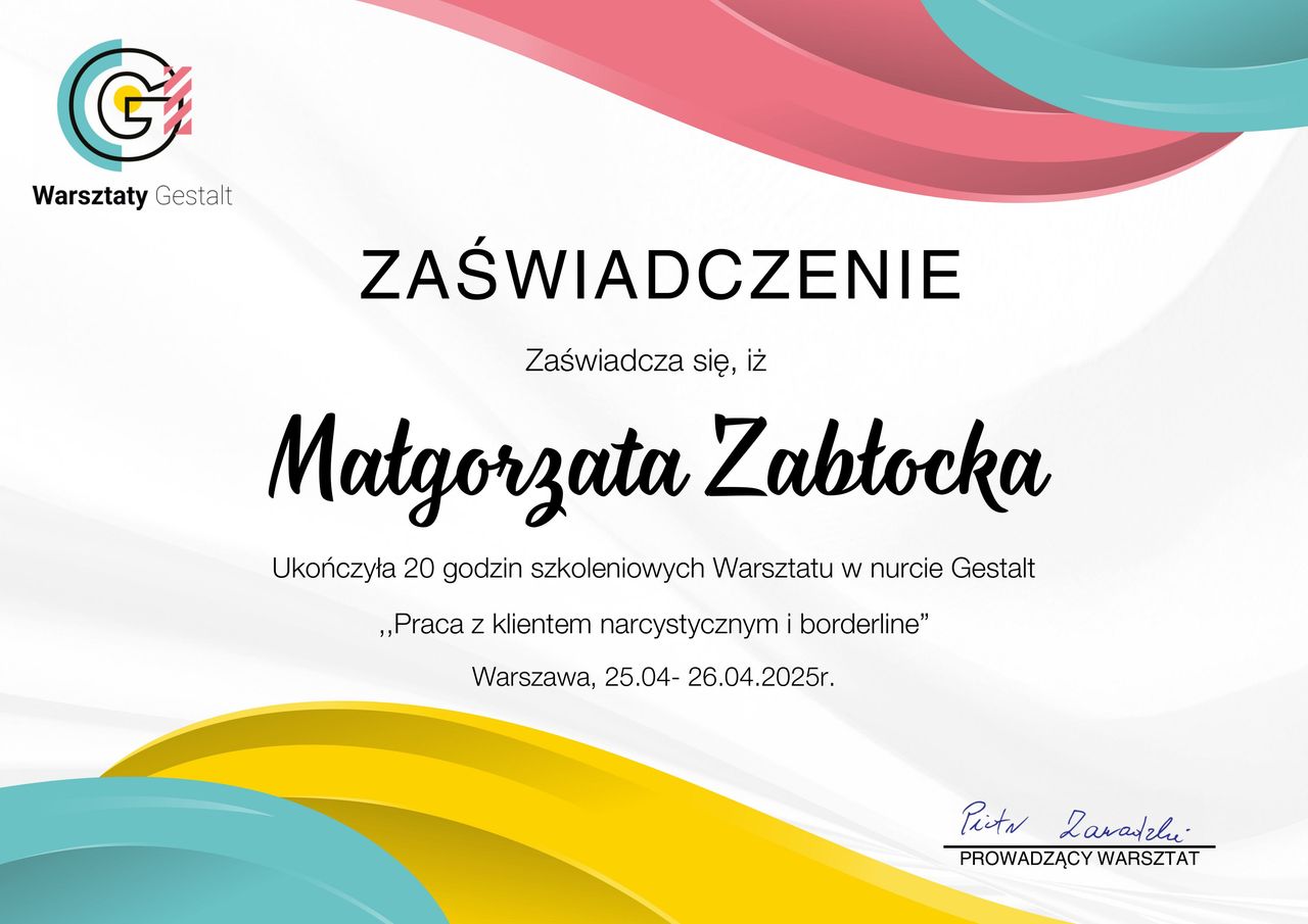 Jestem absolwentką magisterskich studiów psychologicznych ze specjalizacją kliniczną oraz psychoterapeutką w trakcie 4 letniego całościowego profesjonalnego szkolenia psychoterapeutycznego w nurcie Gestalt zgodnego z wymaganiami EAGT oraz EAP.