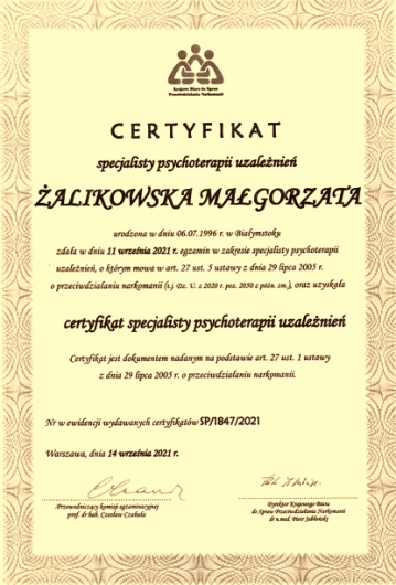 Jestem absolwentką Wydziału Pedagogiki Specjalnej Akademii Pedagogiki Specjalnej w Warszawie (specjalizacja profilaktyka społeczna z resocjalizacją), certyfikowaną specjalistką uzależnień, psychoterapeutką w trakcie procesu certyfikacji w nurcie terapii poznawczo-behawioralnej, terapeutką EMDR. Stale rozwijam się uczestnicząc w szkoleniach m.in. z terapii skoncentrowanej na rozwiązaniach, dialogu motywującego, terapii EMDR.