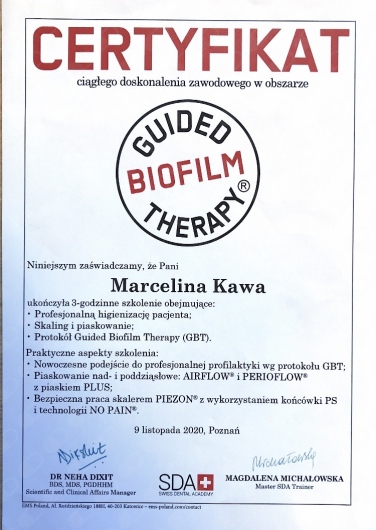 Jaki jest zakres porad oferowanych przez Marcelina Kawa?Marcelina Kawa to higienistka/higienista stomatologiczny. Na podstawie swojego doświadczenia i wykształcenia Marcelina Kawa oferuje usługi takie jak: piaskowanie, Wybielanie zębów, scaling, fluoryzacja zębów, pakiet higienizacyjny z instruktażem, Guided Biofilm Therapy, Guided Biofilm Therapy - dzieci, Piaskowanie + fluoryzacja.