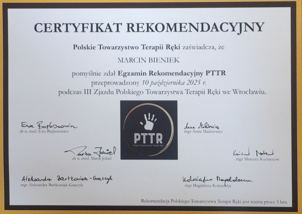 Certyfikowany Terapeuta Ręki - Certyfikat Rekomendacyjny Polskiego Towarzystwa Terapii Ręki