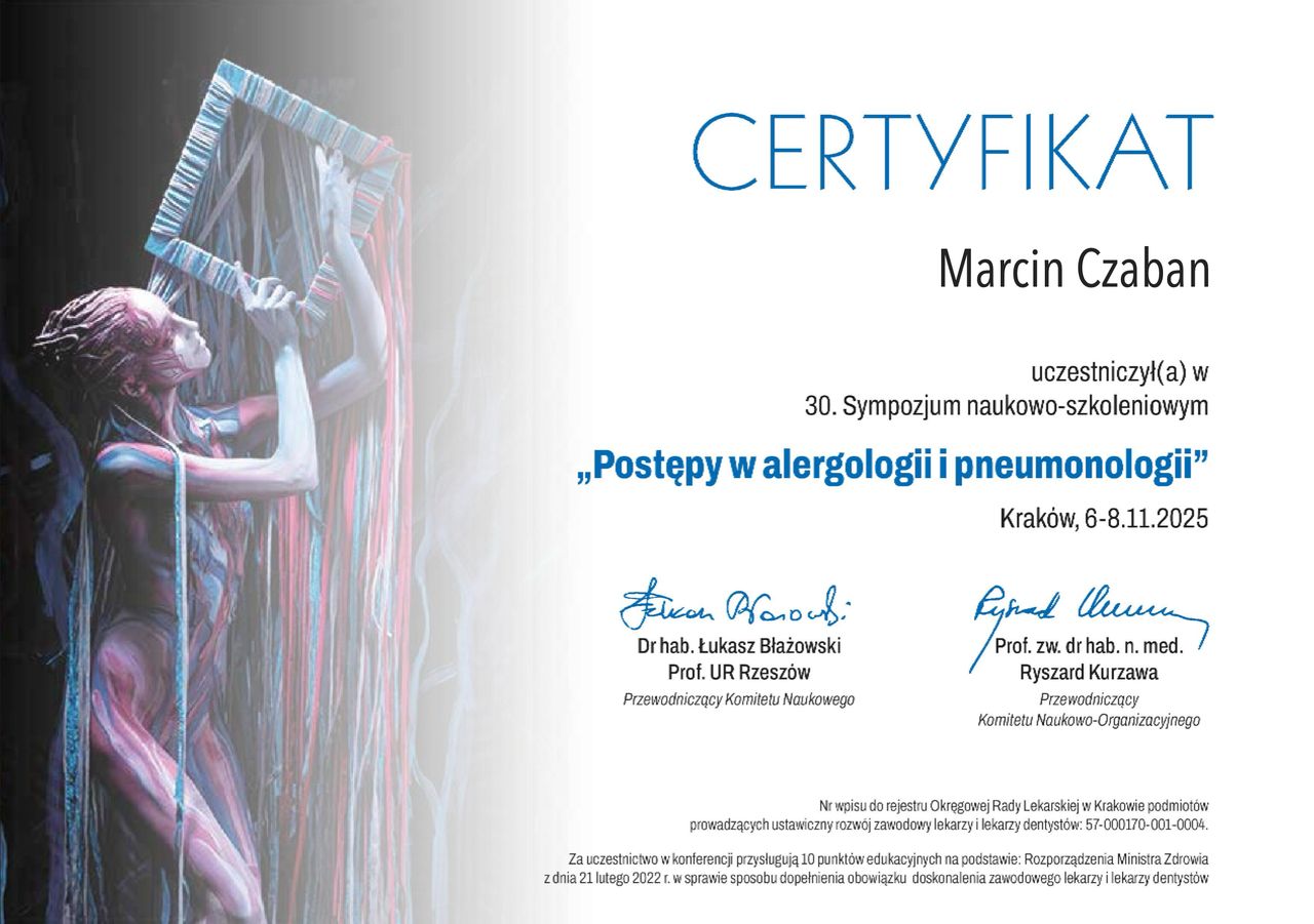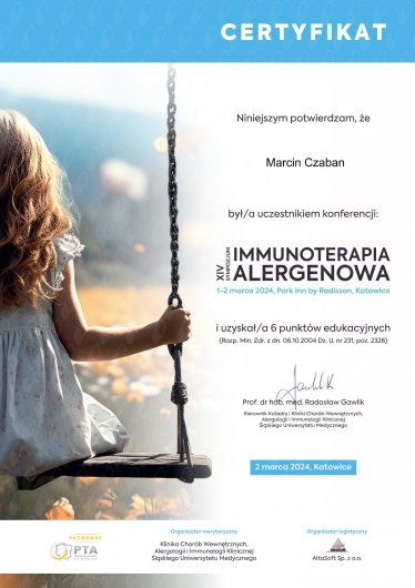 Jaki jest zakres porad oferowanych przez Marcin Czaban?Marcin Czaban to alergolog, alergolog dziecięcy. Na podstawie swojego doświadczenia i wykształcenia Marcin Czaban oferuje usługi takie jak: konsultacja alergologiczna, Immunoterapia, Spirometria + konsultacja alergologiczna, spirometria z próbą rozkurczową + konsultacja alergologiczna, konsultacja alergologiczna + naskórkowe testy płatkowe - panel podstawowy, Konsultacja alergologiczna + punktowe testy skórne, naskórkowe, konsultacja alergologiczna + spirometria z próbą rozkurczową, konsultacja alergologiczna online.